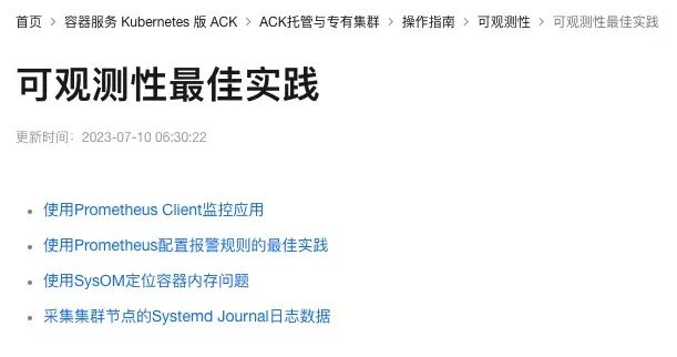 可观测性最佳实践: https://help.aliyun.com/zh/ack/ack-managed-and-ack-dedicated/user-guide/best-practices-for-observability/