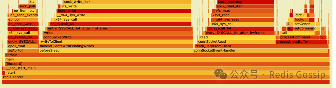 可能大家有一个疑问:为什么 Redis 采用了 IO 多线程的方式提高性能?下面是 Redis 单线程模式下 SET/GET 命令压测时的火焰图,我们清晰地可以看到 Redis 的主要消耗在于网络 IO 读写,而命令执行只占用很小的比例。