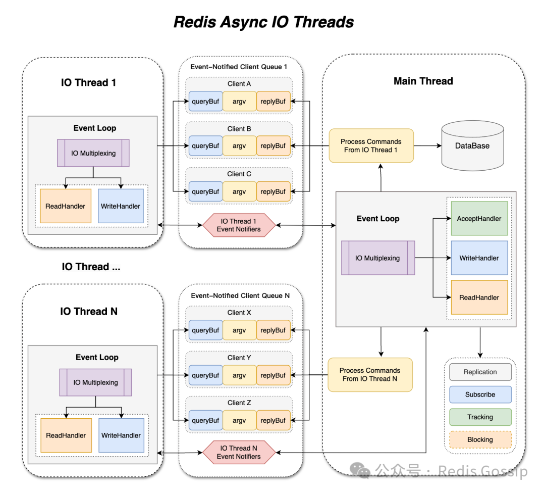主线程在 accept 新连接后将客户端分配给 IO 线程 IO 线程在完成客户端的请求读取和命令解析后会通知主线程 主线程处理来自 IO 线程的命令并生成回复并再转回给相应的 IO 线程 IO 线程负责将回复写回客户端,并继续处理客户端的读写事件