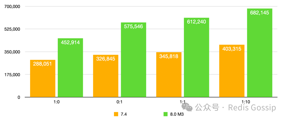 测试分为两组,区别仅在 KV 大小,其他一致,300 万个 key,400 个 client, 压测时间为 60s, 写读比例有四种:1:0、0:1、1:1、1:10。除了100%读测试外(避免 Key Miss),每次测试前都会重启 Redis,清空数据。在测试时发现 IO 线程数在 6 的时候主线程基本打满,所以 io-threads