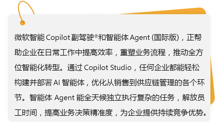 归根结底,每个公司都由两个核心要素构成:员工和流程。通过利用智能Copilot副驾驶®和智能体Agent,你可以同时加强这两个要素,为你的企业提供保持竞争优势的最佳机会。