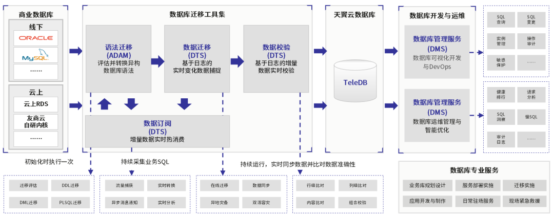 天翼云通过数据传输服务(DTS)与TeleDB数据库的结合,为企业打造了全链路的一站式数据迁移解决方案,能完美应对上述挑战。天翼云数据传输服务软件(DTS)V3.0是天翼云数据库自主研发的新一代数据库在线迁移和数据同步产品,集成Adam语法转换工具,具备迁移评估、结构迁移、全量同步、增量同步、数据稽查、数据订阅六大功能为一体,与天翼云数据库TeleDB高度兼容,形成完整的数据迁移解决方案,帮助用户实现不停服数据迁移、数据异地灾备/双活、跨境数据同步、缓存更新等多种应用场景,成为企业数字化转型中的加速器。