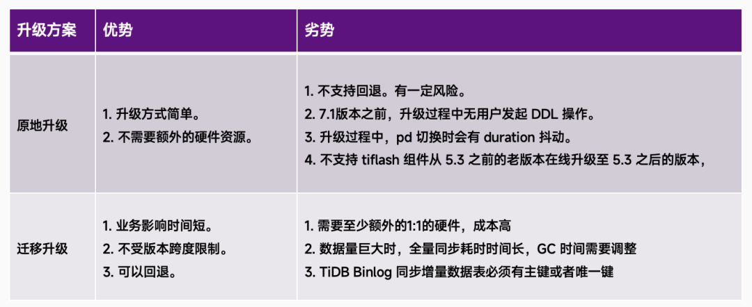 爱奇艺在升级过程中主要考虑了两种方案:原地升级和迁移升级。原地升级的优势在于操作简单,无需额外的硬件资源,但存在不支持回退、升级过程中禁止用户发起 DDL 操作等风险。迁移升级则具有业务影响时间短、不受版本跨度限制、可回退等优点,但需要额外的硬件资源,成本较高。根据集群的实际情况和业务需求,爱奇艺灵活运用这两种方案,确保了升级过程的顺利进行。