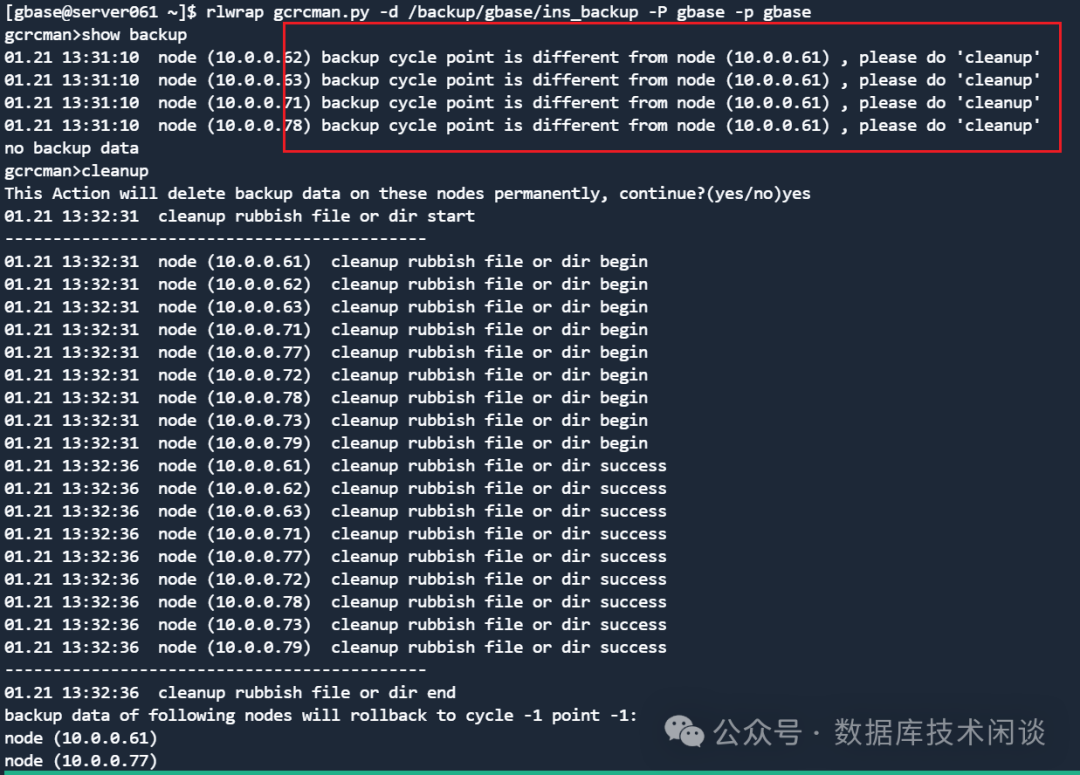 [gbase@server061 ~]$ rlwrap gcrcman.py -d backup/gbase/ins_backup -P gbase -p gbase