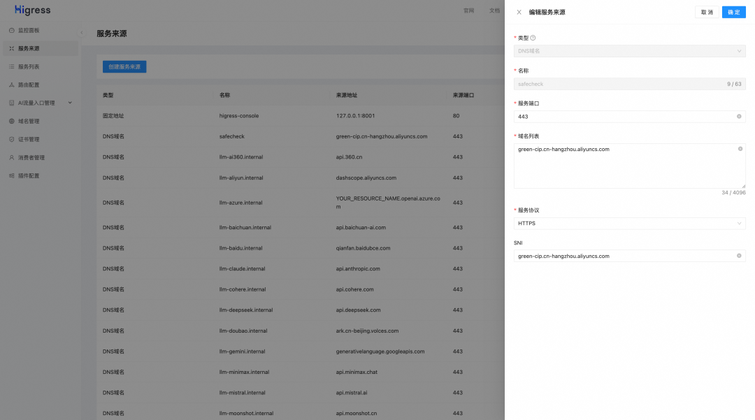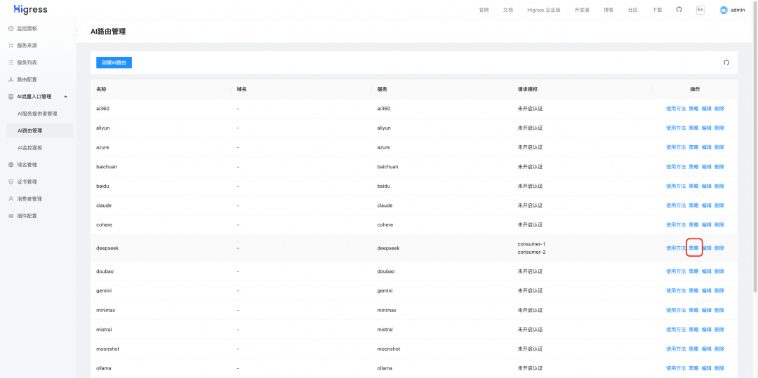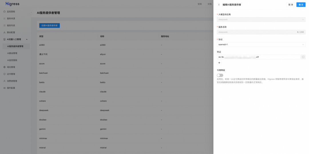 根据启动脚本提供的地址可以访问 Higress 控制台,Higress AI 网关内置了主流的 LLM Provider,仅需要在控制台上简单填写APIKey即可完成 provider的配置,例如配置 deepseek provider: