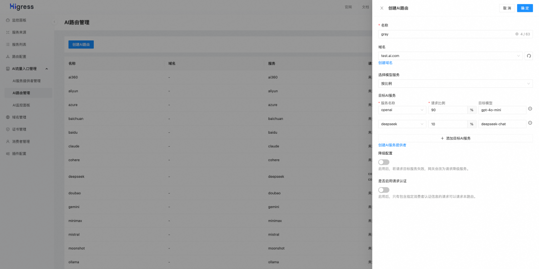 网关支持模型按比例灰度能力,便于用户在模型间迁移,如下图所示,请求流量将有90%被路由到 OpenAI,10%被路由到 Deepseek。
