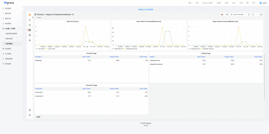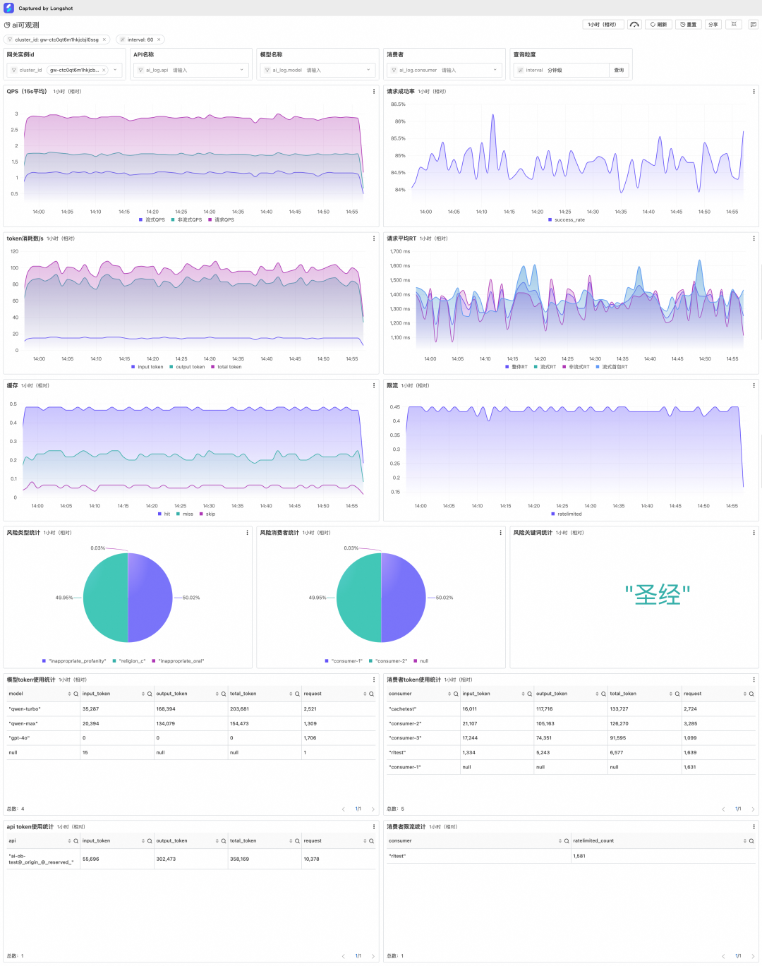 网关具备开箱即用的 AI 可观测能力,提供了全局、provider 维度、模型维度以及消费者维度的 token 消耗/延时等观测能力。