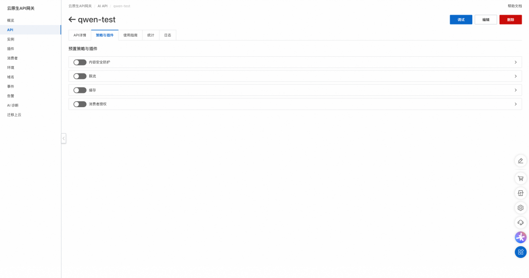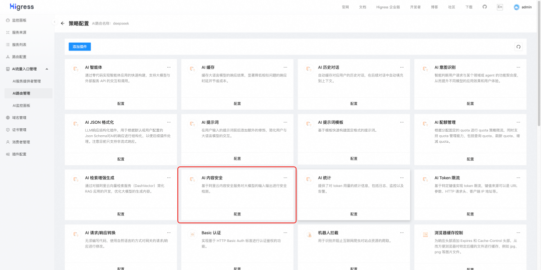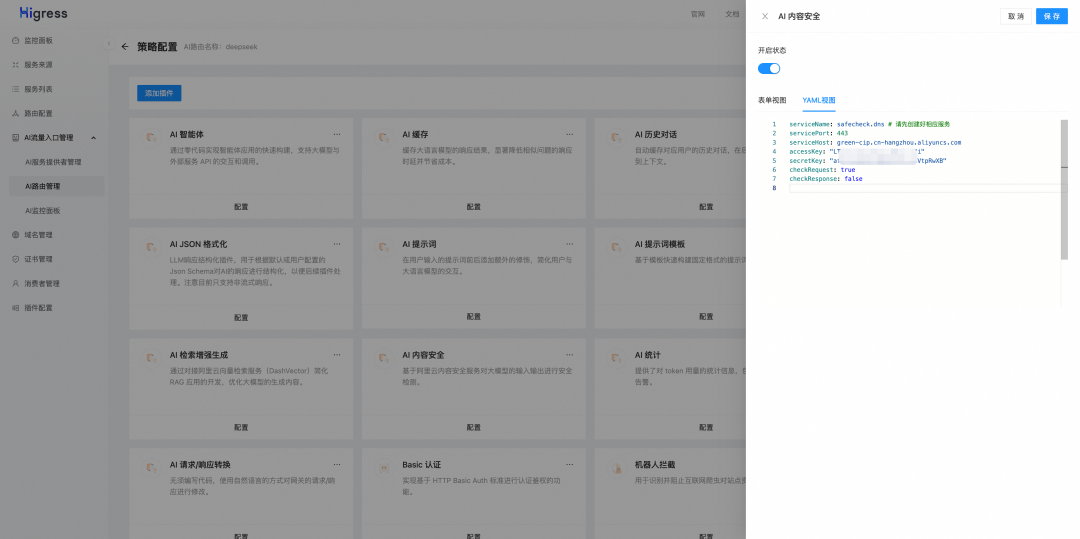 相比于开源 Higress AI 网关,云原生 API 网关 AI API 具有更强大的可观测能力以及更便捷的策略配置能力,用户可一键接入内容安全、限流、缓存等功能,无需填写 yaml 配置。