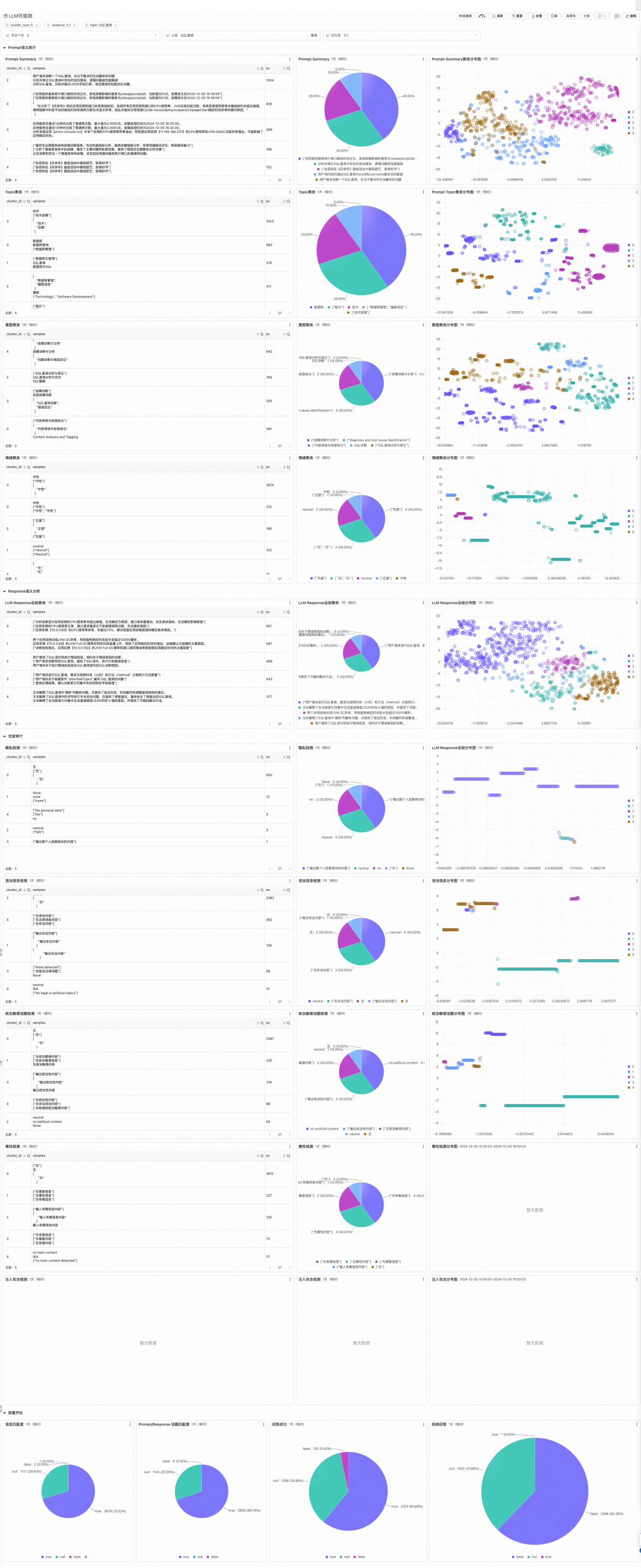 此外,我们联合 SLS 提供了基于大模型对话的语义向量索引功能以及进阶的语义富化功能,可以实现话题聚类、意图识别、情绪识别、质量评估等能力。