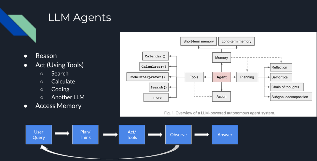 比如,在下图中,LLM Agent 包含多个组件,它们可以在迭代过程中互动,不仅可以做相似性检索,还能完成包括规划、推理、工具使用和记忆等多种功能。