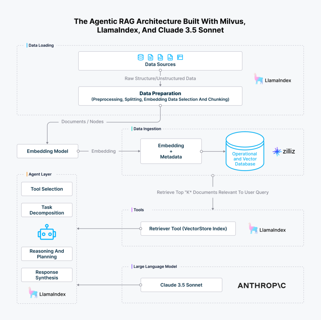 图 5:使用 Milvus、LlamaIndex 和 Claude 3.5 Sonnet 构建的 Agentic RAG 架构