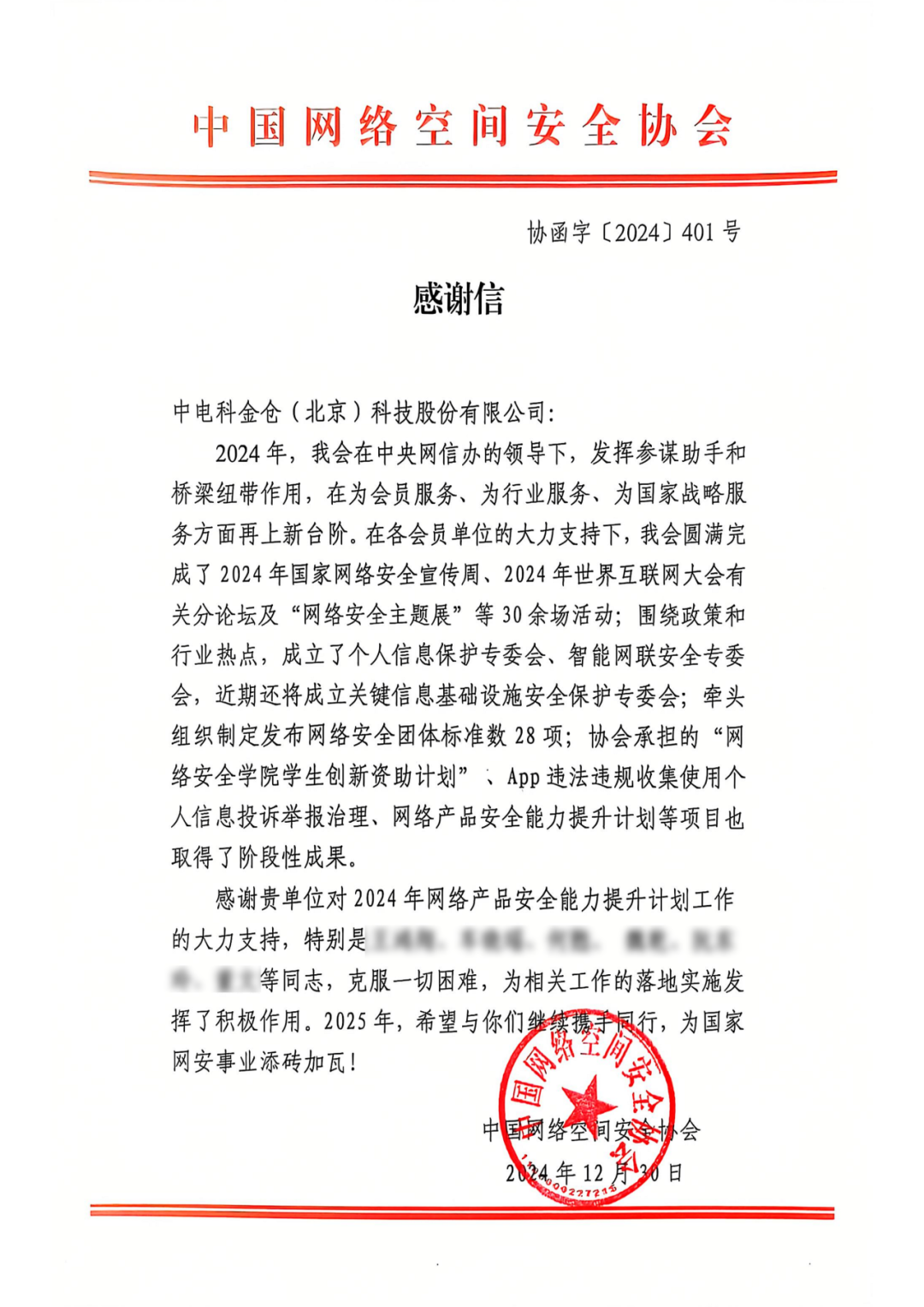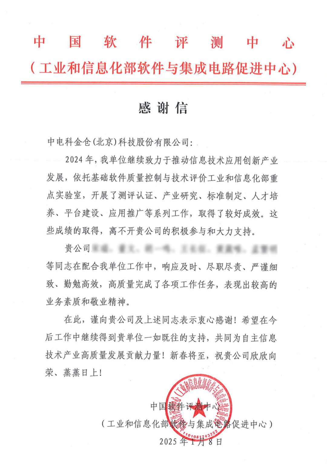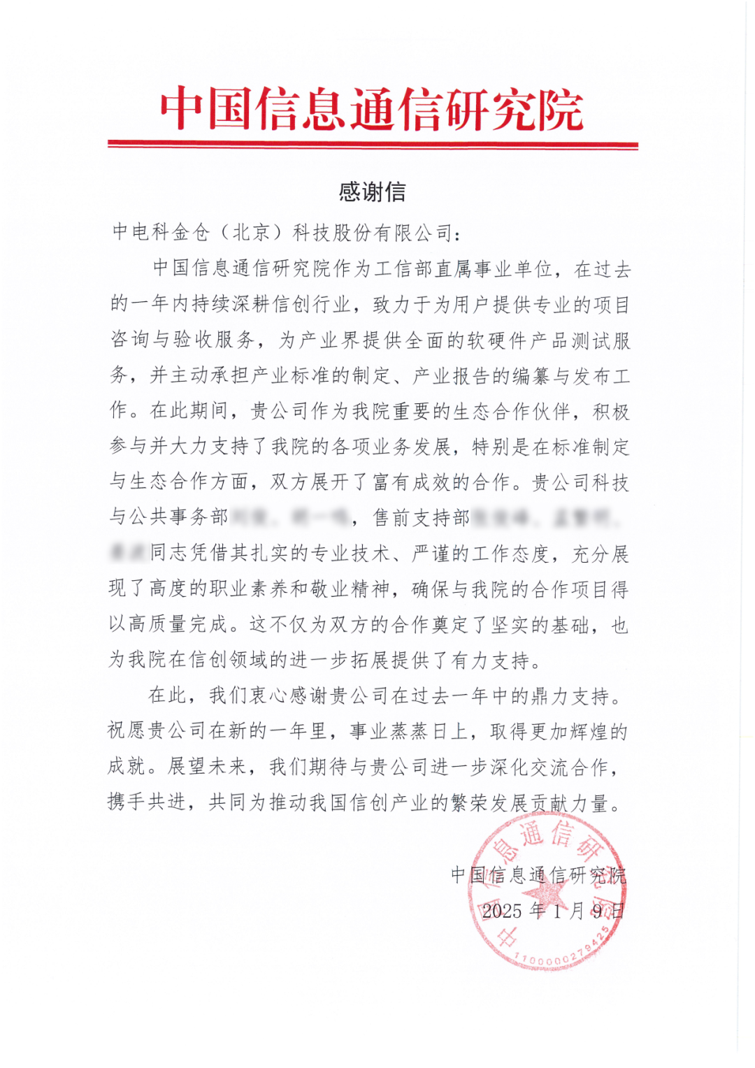 近日,金仓数据库陆续收到来自中国信通院、中国软件测评中心、中国电子工业标准化技术协会、中国网络空间安全协会、中国人民银行旗下金融信创生态实验室发来感谢信,对金仓数据库在2024年与各方主体合作过程中展现出来的专业素养和担当精神表示感谢。