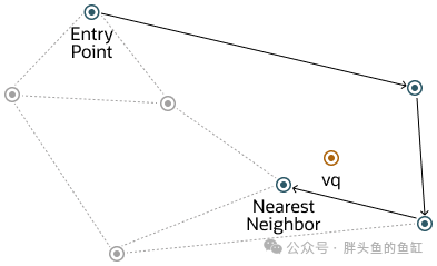 用于向量搜索的可导航小世界 (NSW) 图遍历从图中预定义的入口点开始,访问一组密切相关的向量。搜索算法采用两个关键列表:候选列表(遍历图时遇到的动态更新向量列表)和结果列表(包含迄今为止找到的与查询向量最接近的向量)。随着搜索的进行,算法会浏览整个图,通过探索和评估可能比结果中的向量更近的向量来不断优化候选列表。一旦候选列表中没有比结果中最远的向量更近的向量,则该过程结束,这表明已达到局部最小值并已确定与查询向量最接近的向量。下图对这一点进行了展示:
