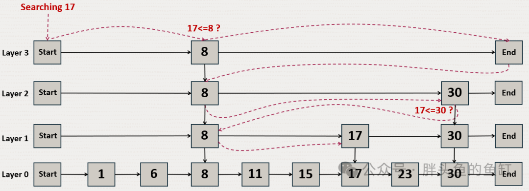 概率跳跃表结构使用多层链接列表,其中上层跳过的数字比下层跳过的数字多。在此示例中,要搜索数字 17。从顶层开始,然后跳转到下一个元素,直到找到 17、到达列表末尾或找到大于 17 的数字。当到达列表末尾或找到大于 17 的数字时,则从上一层中最新的小于 17 的数字开始。