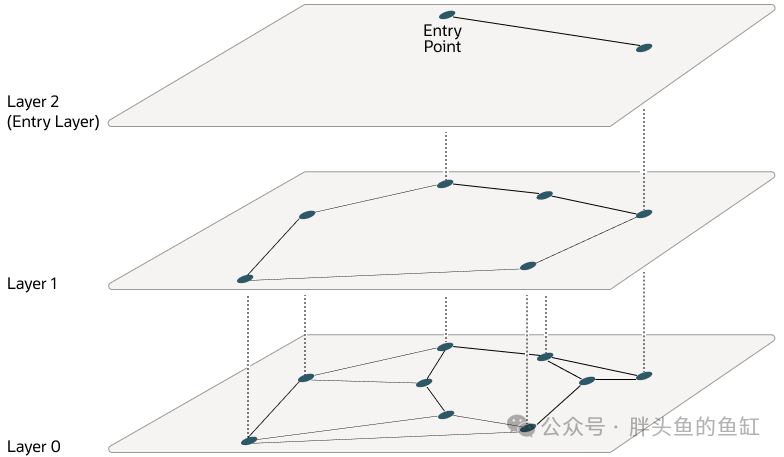 层是使用内存图(而非 Oracle 内存图)实现的。每个层都使用单独的内存图。如前所述,在创建HNSW索引时,可以使用 NEIGHBORS 参数微调上层中每个向量的最大连接数,以及使用EFCONSTRUCTION参数微调插入期间搜索的每个步骤中考虑的最近向量候选的最大数量,其中EF代表Enter Factor。