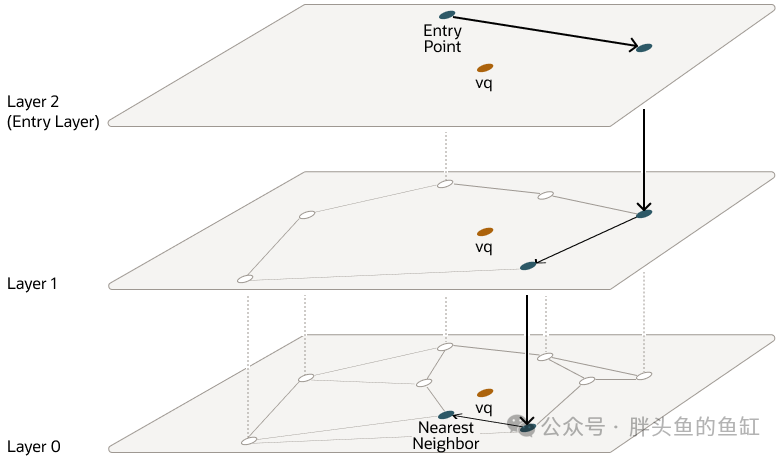 从顶层开始,一层中的搜索从入口向量开始。然后对于每个节点,如果有一个邻居比当前节点更接近查询向量,则跳转到该邻居。算法一直这样做,直到找到查询向量的局部最小值。当在一层中找到局部最小值时,搜索将使用新层中的相同向量转到下一层,并在该层中继续搜索。此过程重复进行,直到找到底层的局部最小值,其中包含所有向量。此时,搜索转换为使用NSW算法围绕最新找到的局部最小值进行近似相似性搜索,以提取与查询向量最相似的前k个向量。虽然上层可以具有NEIGHBORS参数设置的每个向量的最大连接数,但第0层可以具有两倍的连接数。下图说明了此过程: