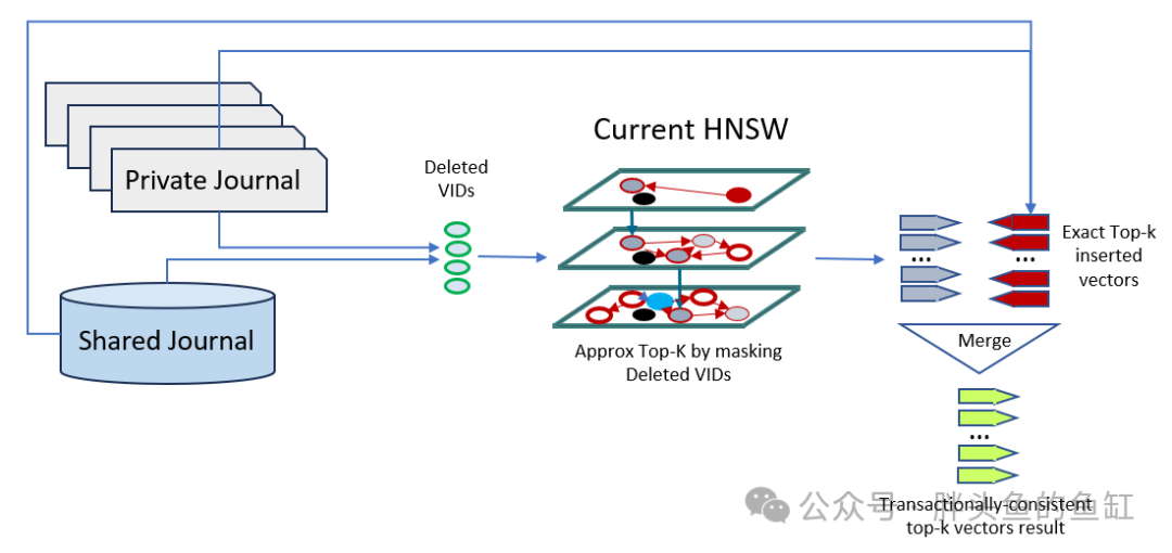 按照DML,通过考虑内存中现有的HNSW图以及查询的私有日志和共享日志来确定事务一致的已删除和插入向量集列表,从而实现读取一致性。这包括从日志中识别已删除向量的精确列表,通过增强过滤器以忽略已删除向量,对当前版本的HNSW索引运行近似 top-K 搜索,对日志中新插入的向量运行精确top-k搜索,并合并两次搜索的结果。