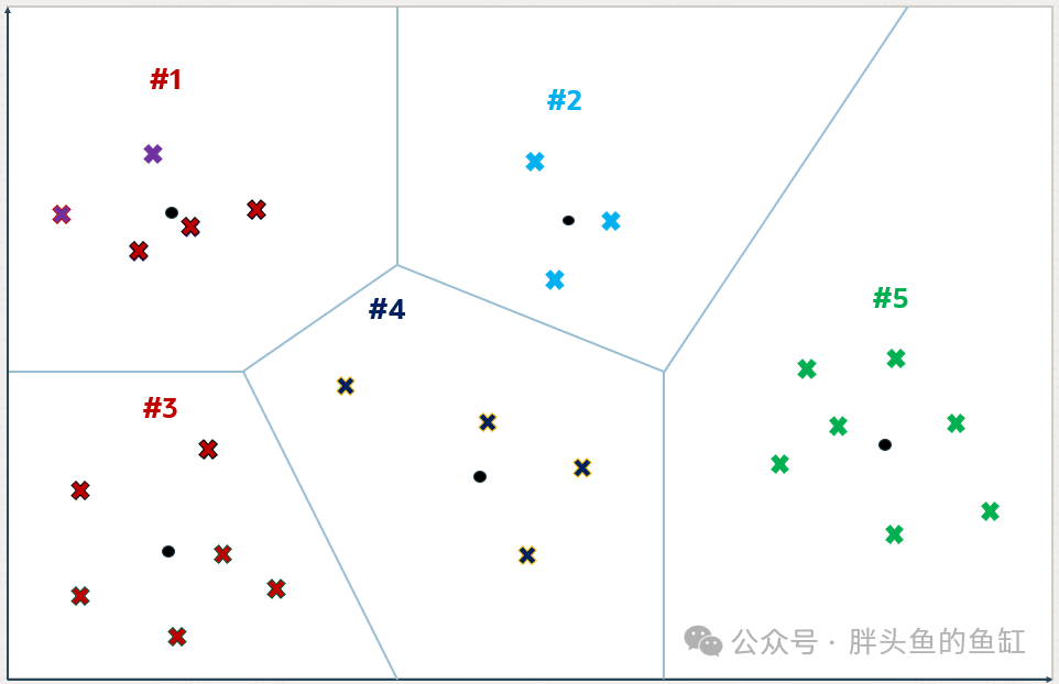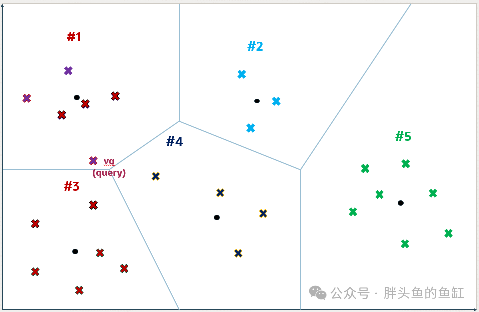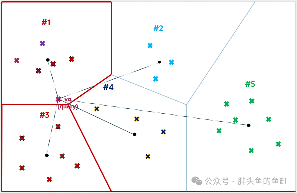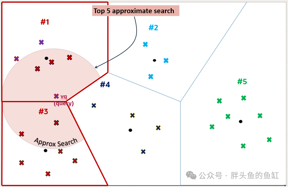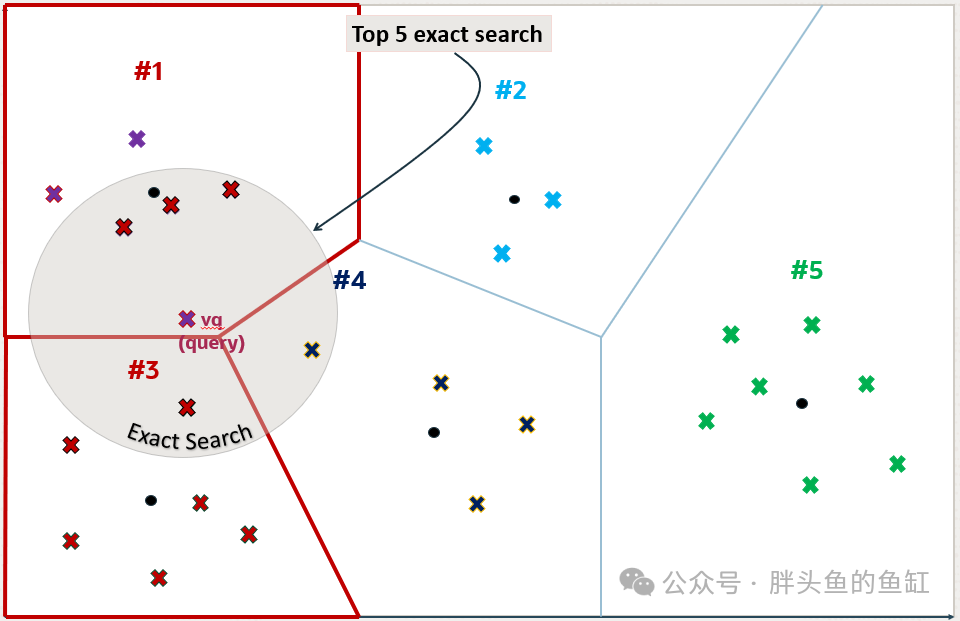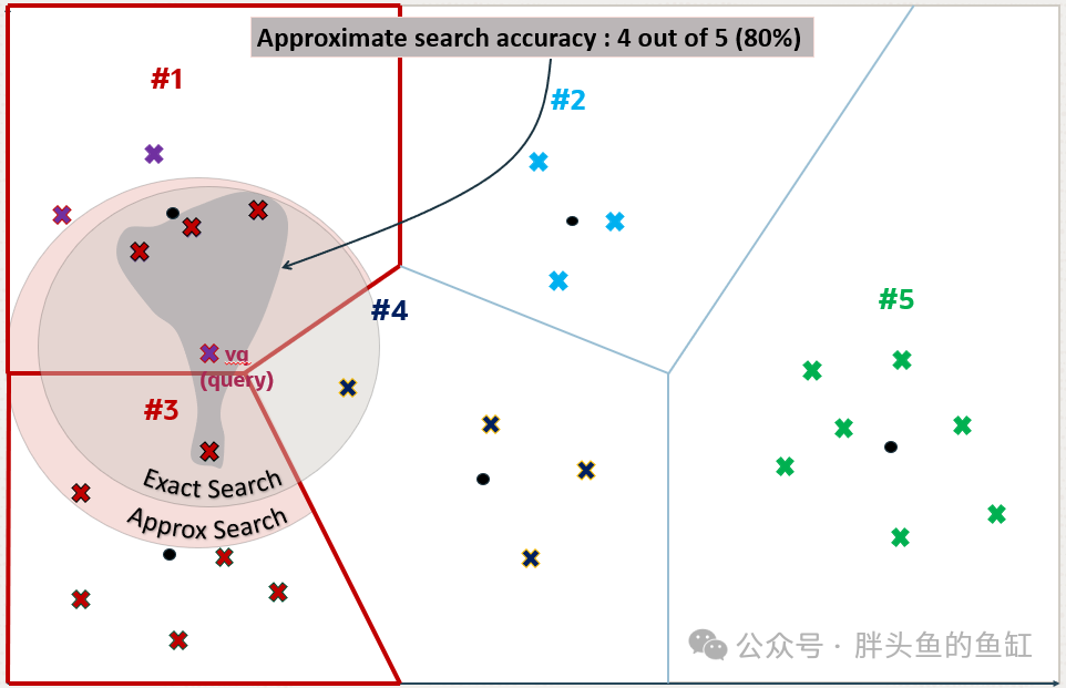 但是,距离vq最近的5个向量并不是通过近似搜索找到的向量。可以看到分区号4中的一个向量比分区号3中检索到的向量之一更接近vq。