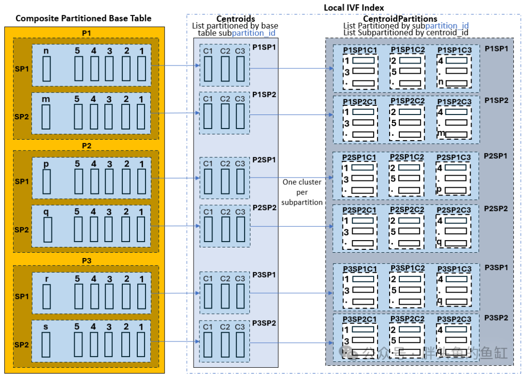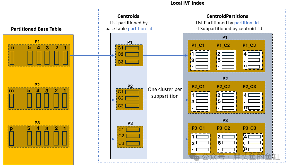 如下图所示,基表有三个分区,创建的本地IVF索引仍然由两个内部表组成:
