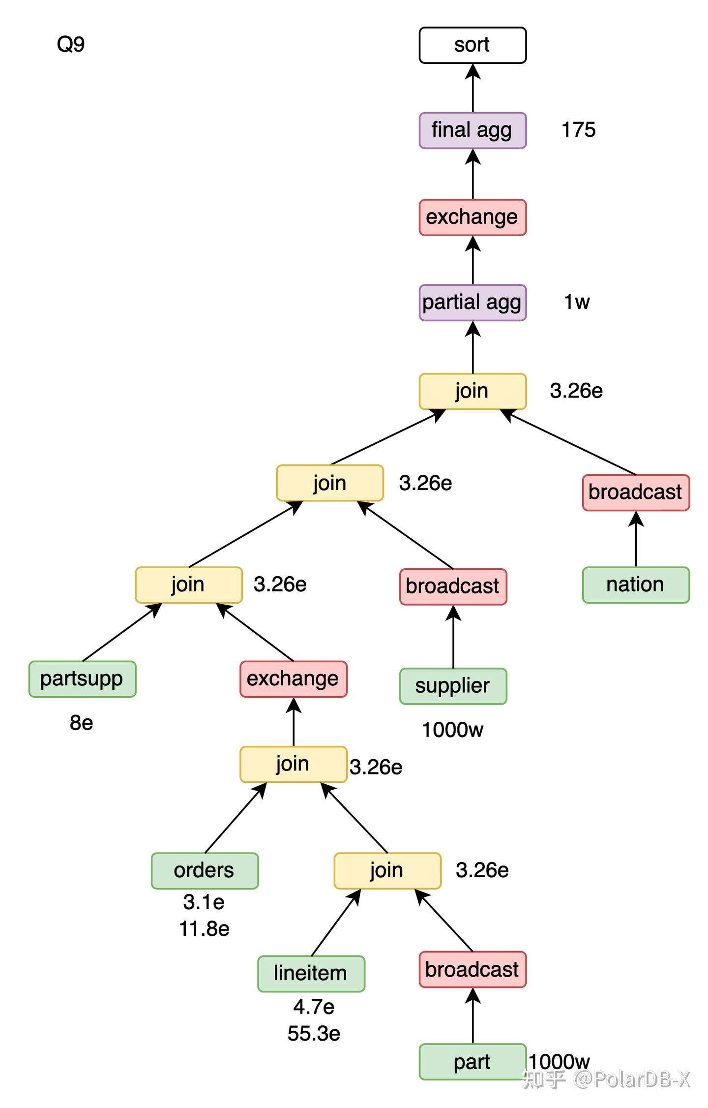 。 Q9的过滤条件p_name like '%goldenrod%',目前没有专门的处理,采用heuristic