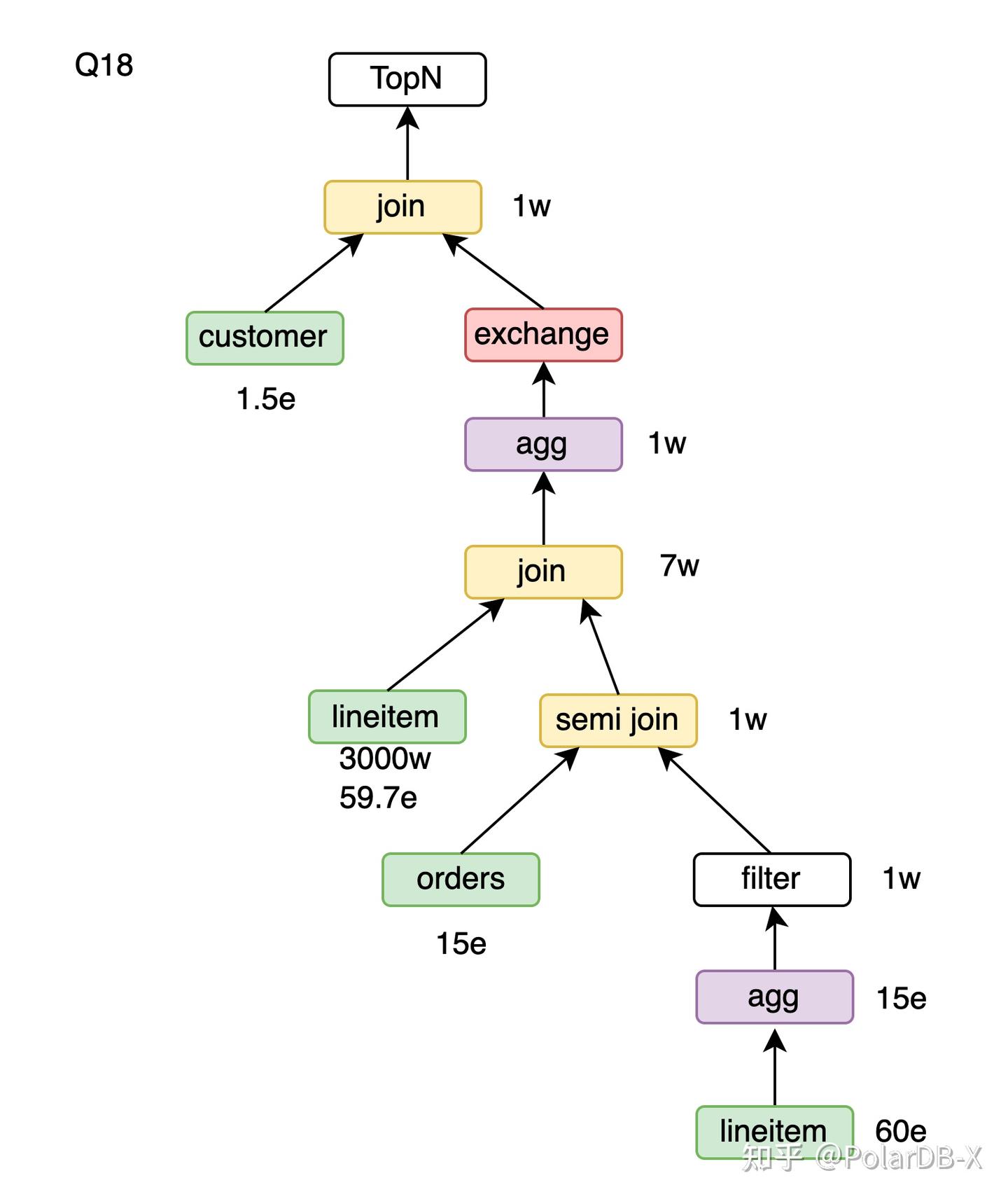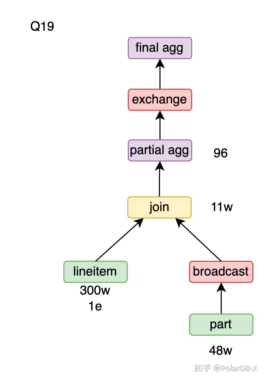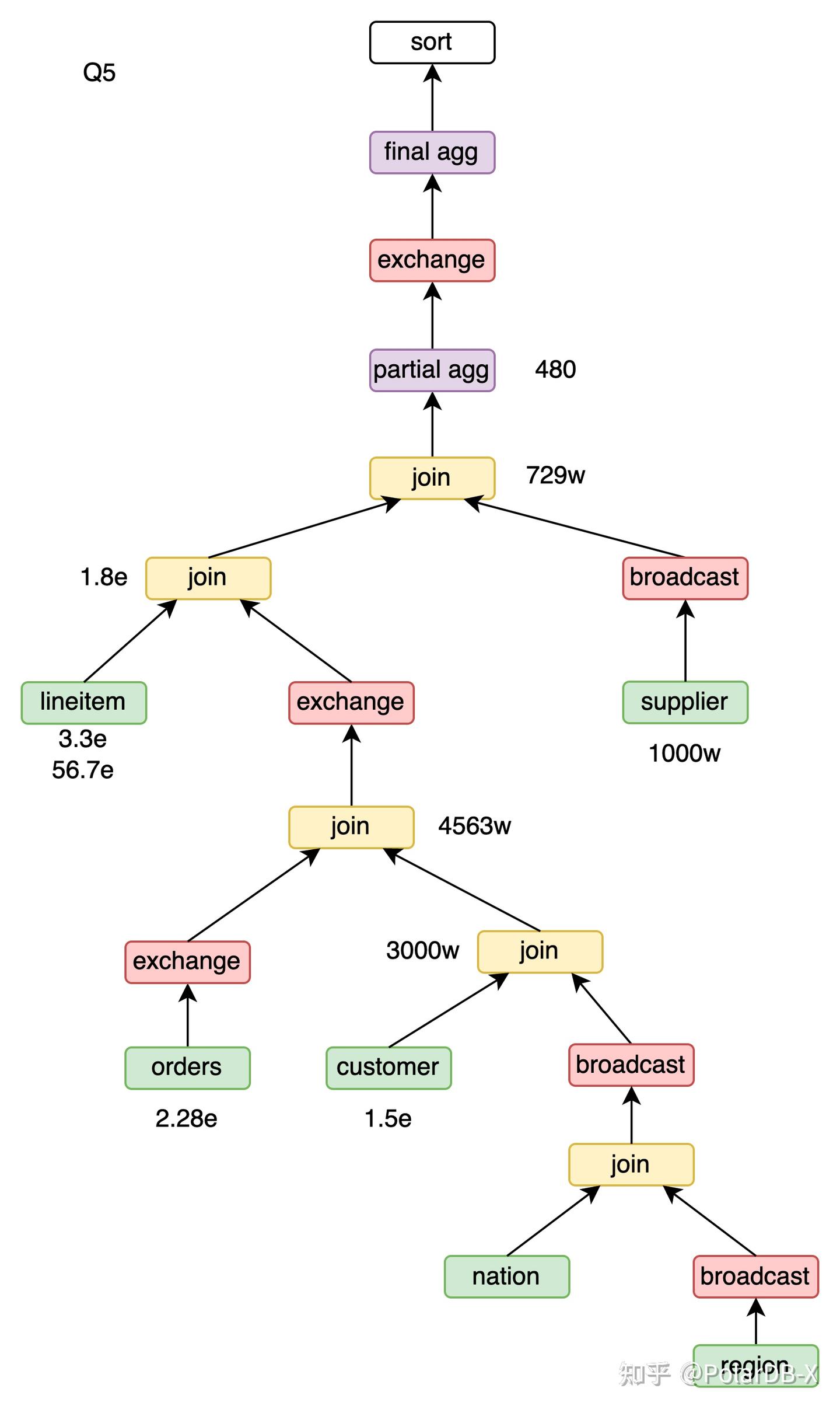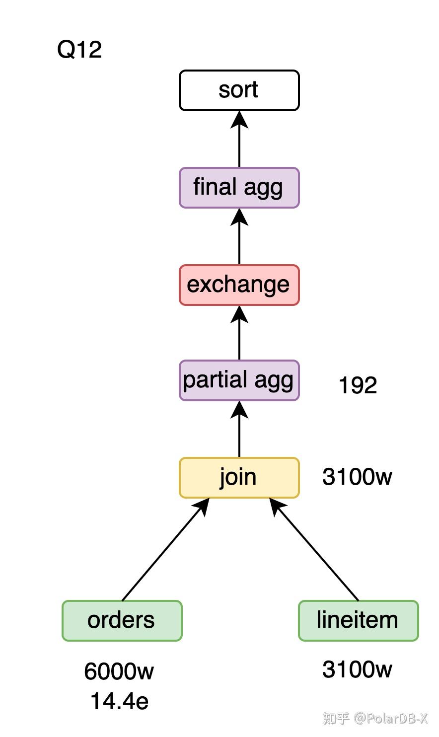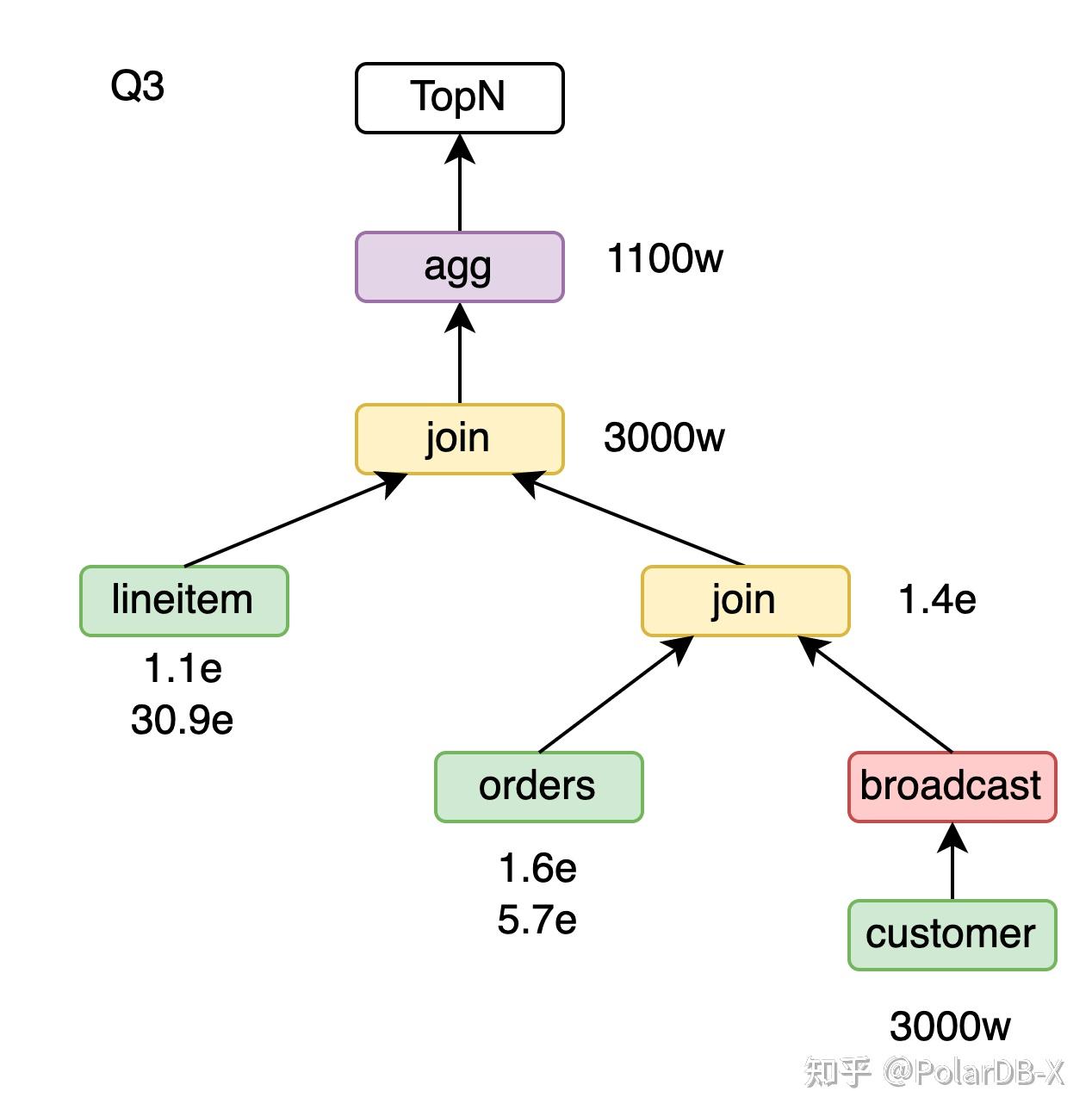 }除了broadcast,也可以用exchange。例如Q3,将orders按o_custkey做exchange来获得o_custkey的分片属性,customer有c_custkey的分片属性,orders join customer可以做partition wise join。接着将orders join customer按o_orderkey做exchange,lineitem join (orders join customer)可以做partition wise join。
