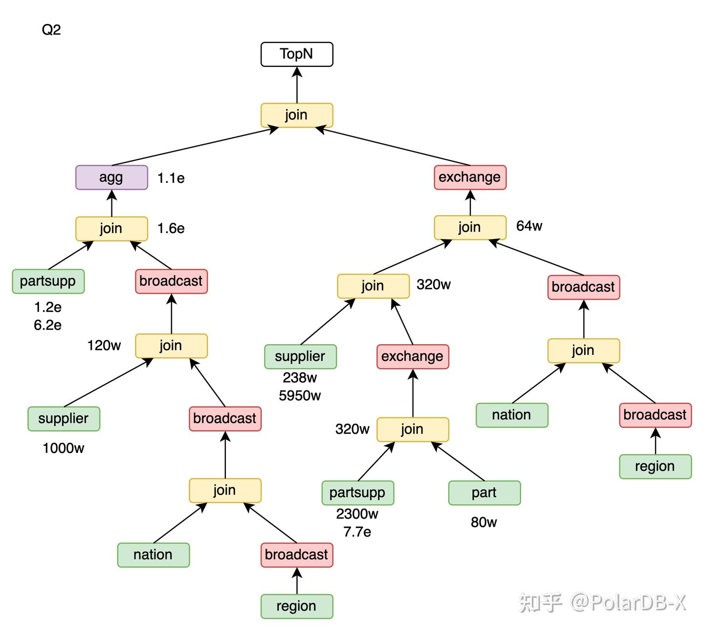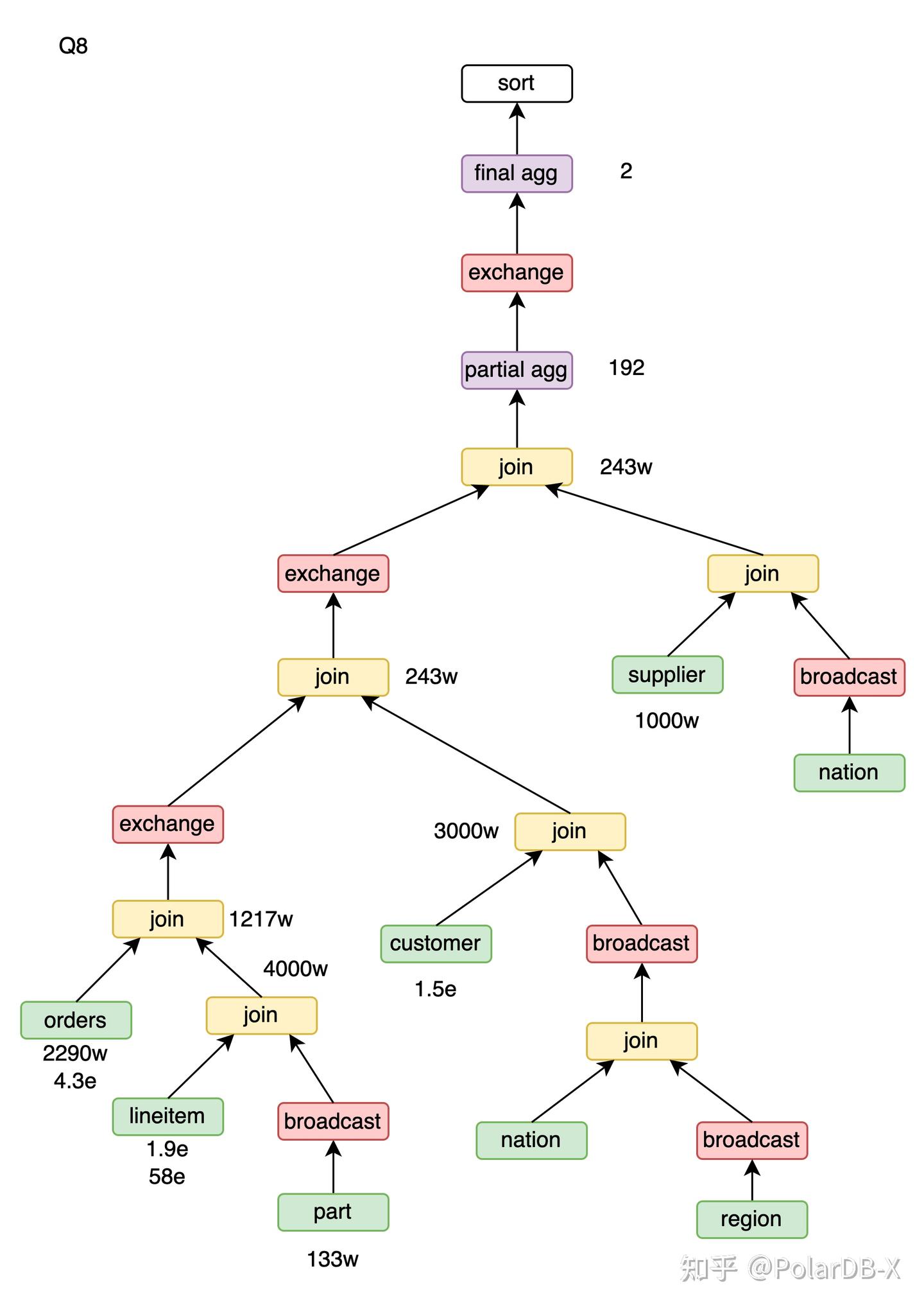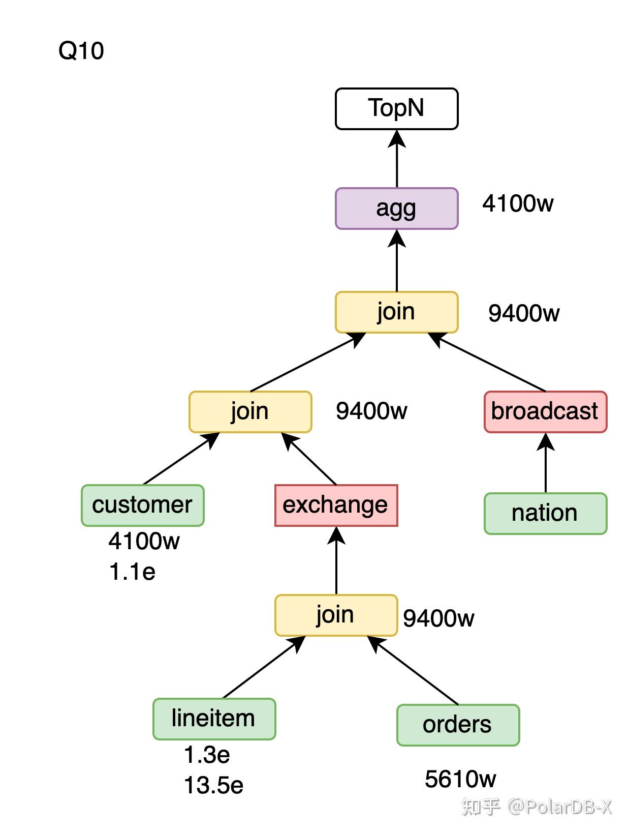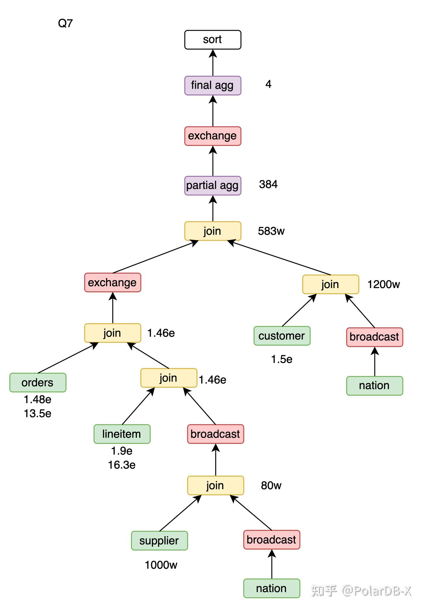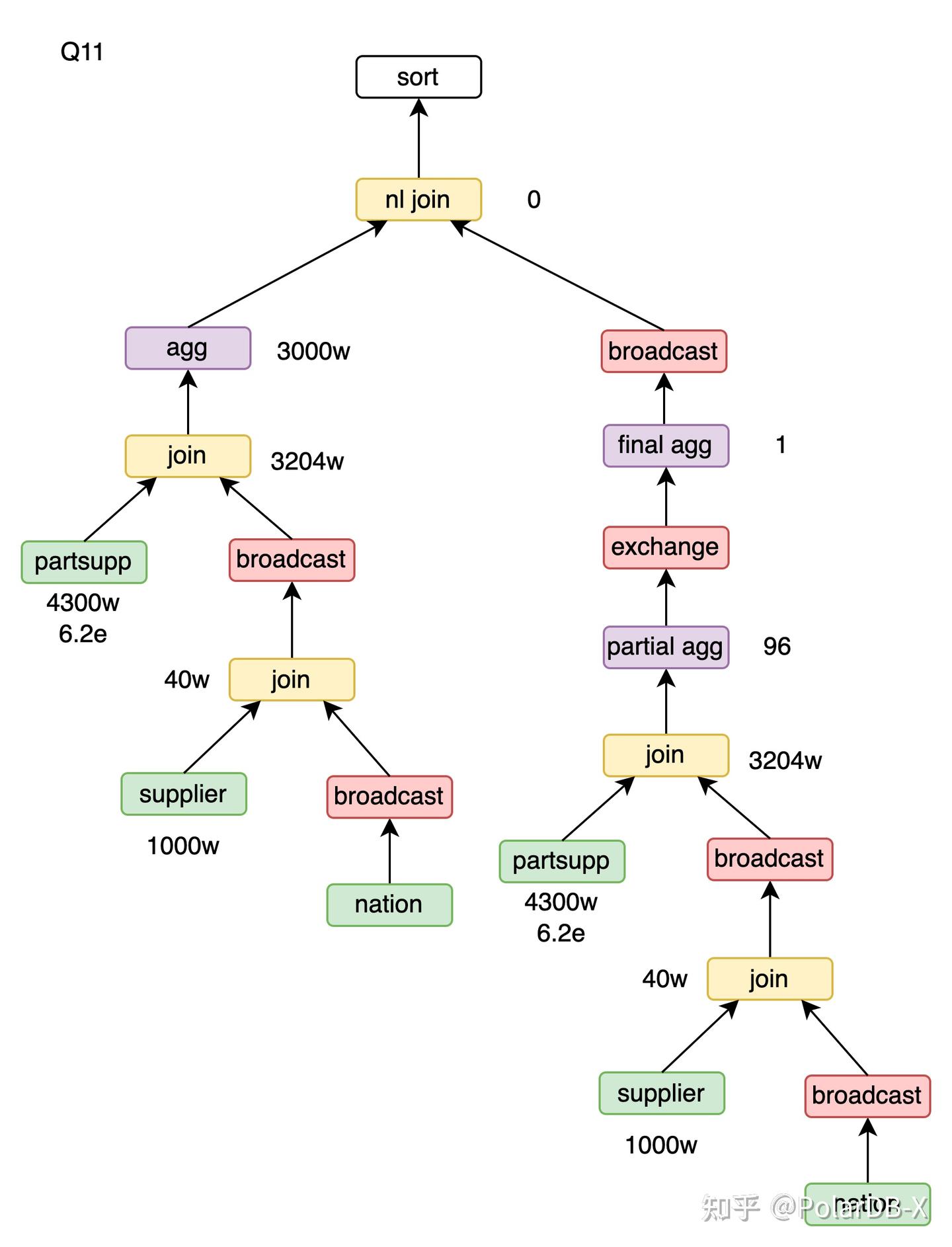 }除了broadcast,也可以用exchange。例如Q3,将orders按o_custkey做exchange来获得o_custkey的分片属性,customer有c_custkey的分片属性,orders join customer可以做partition wise join。接着将orders join customer按o_orderkey做exchange,lineitem join (orders join customer)可以做partition wise join。