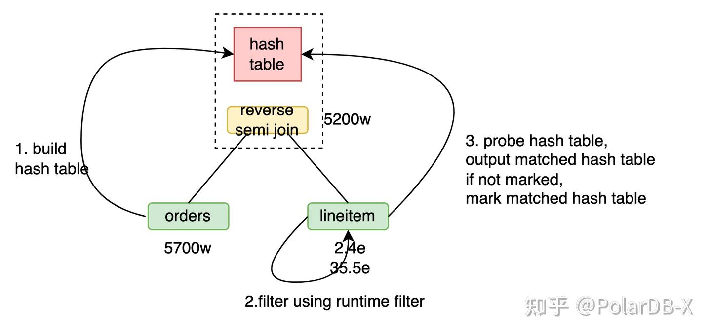 引入runtime filter的orders reverse semi hash join lineitem的流程为