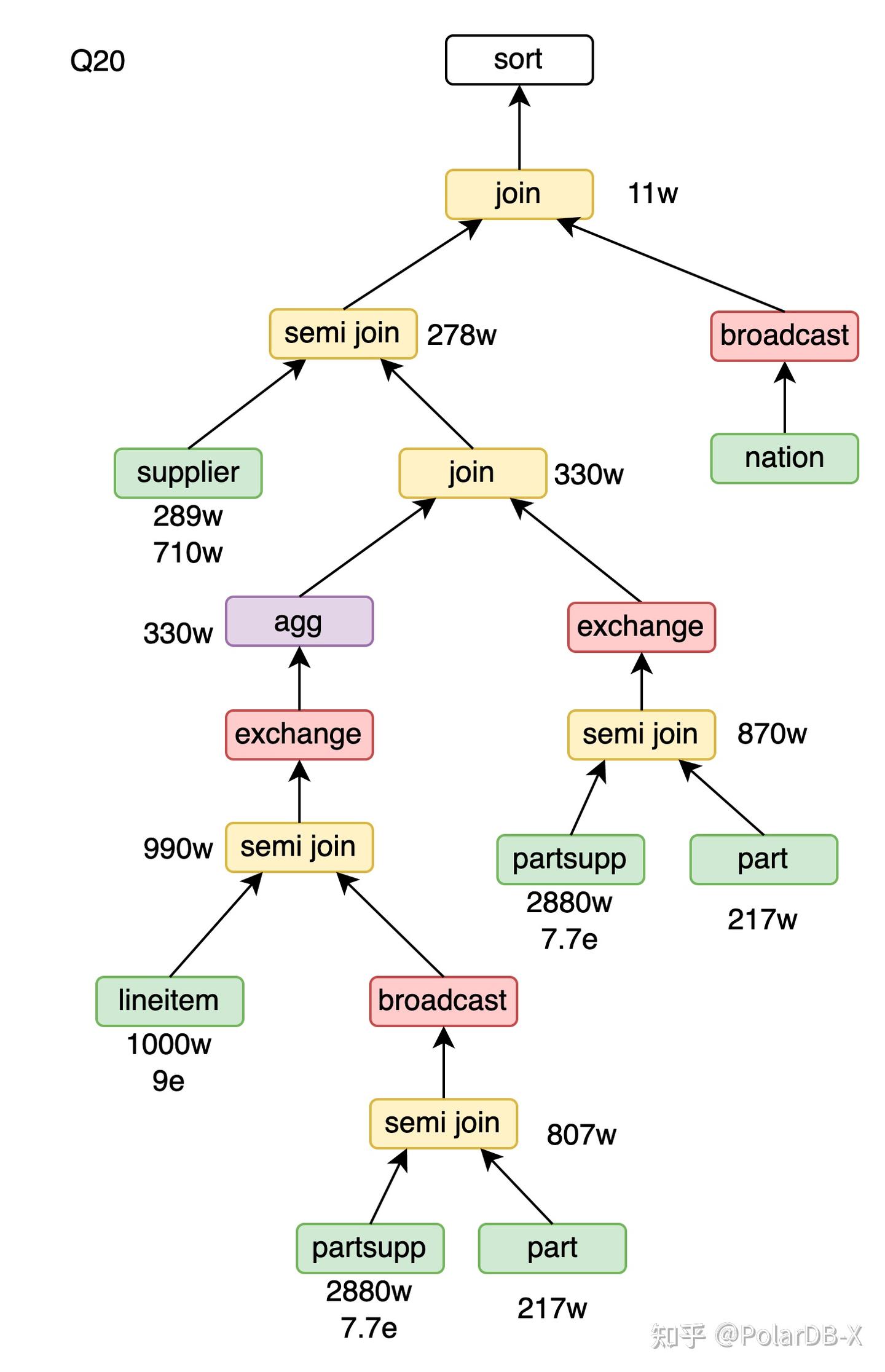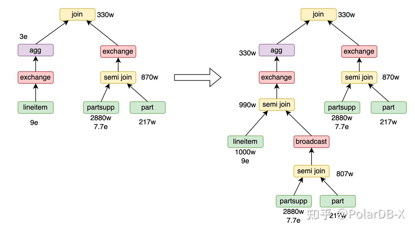 目前,PolarDB-X的runtime filter在join的probe端无法穿透shuffle操作。这一限制对Q20查询的性能带来了负面影响:在lineitem表上的agg计算出大量冗余结果,在agg之前使用runtime filter将其筛选掉可以提升性能。然而,lineitem表和agg操作之间的shuffle阻碍了runtime filter的下推。为了解决此问题,我们引入了一个CBO规则:将join的右孩子节点复制,并与agg的输入进行semi join,从而起到runtime filter的作用。