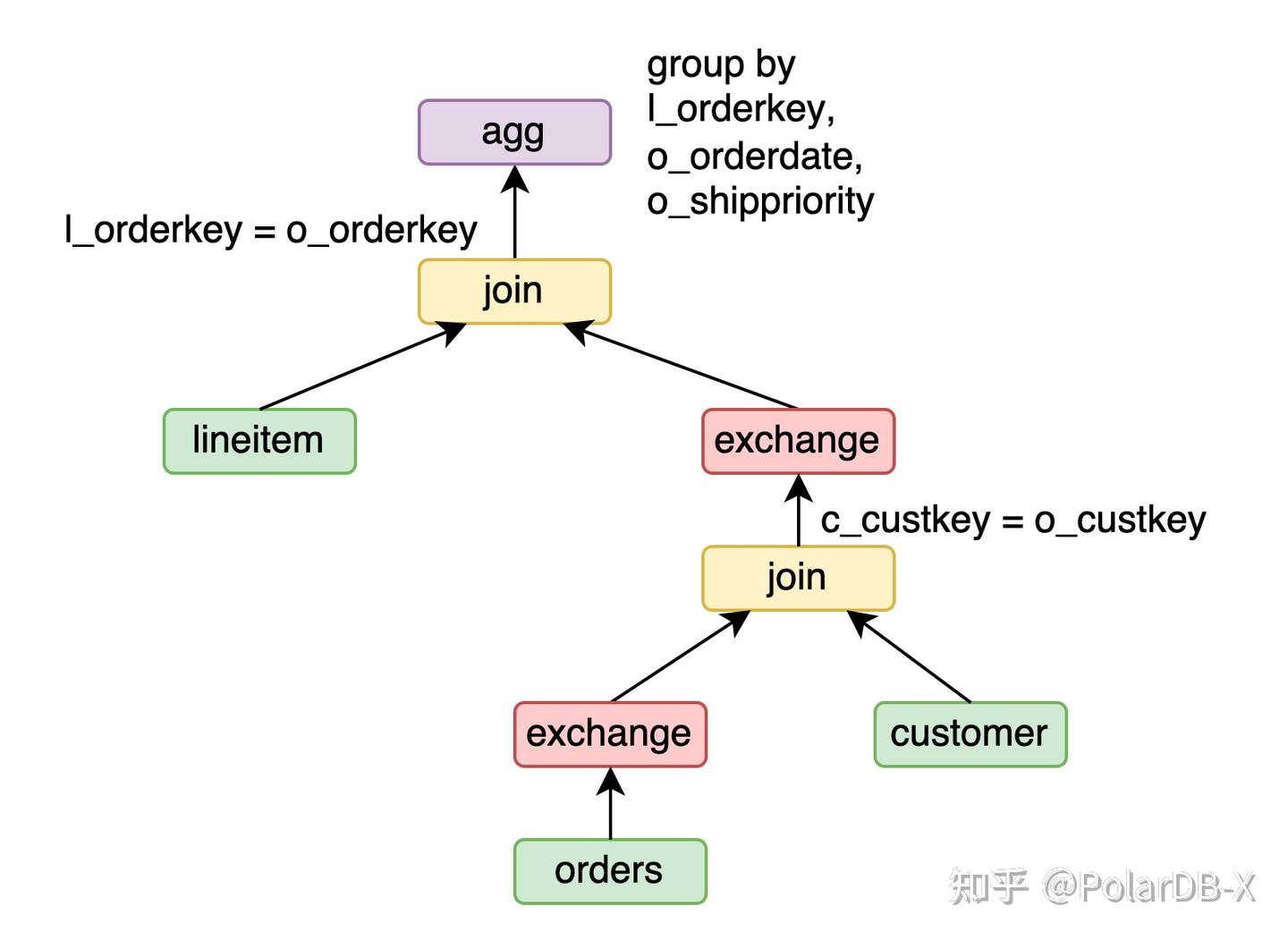 对于orders join customer,将customer做广播,orders join customer可以保持o_orderkey的分片属性。进一步 lineitem join (orders join customer),lineitem有l_orderkey的分片属性,orders join customer有o_orderkey的分片属性,可以做partition wise join,并保持l_orderkey的分片属性。最后的group by l_orderkey, o_orderdate, o_shippriority,由于输入保持l_orderkey的分片属性,可以做partition wise agg。