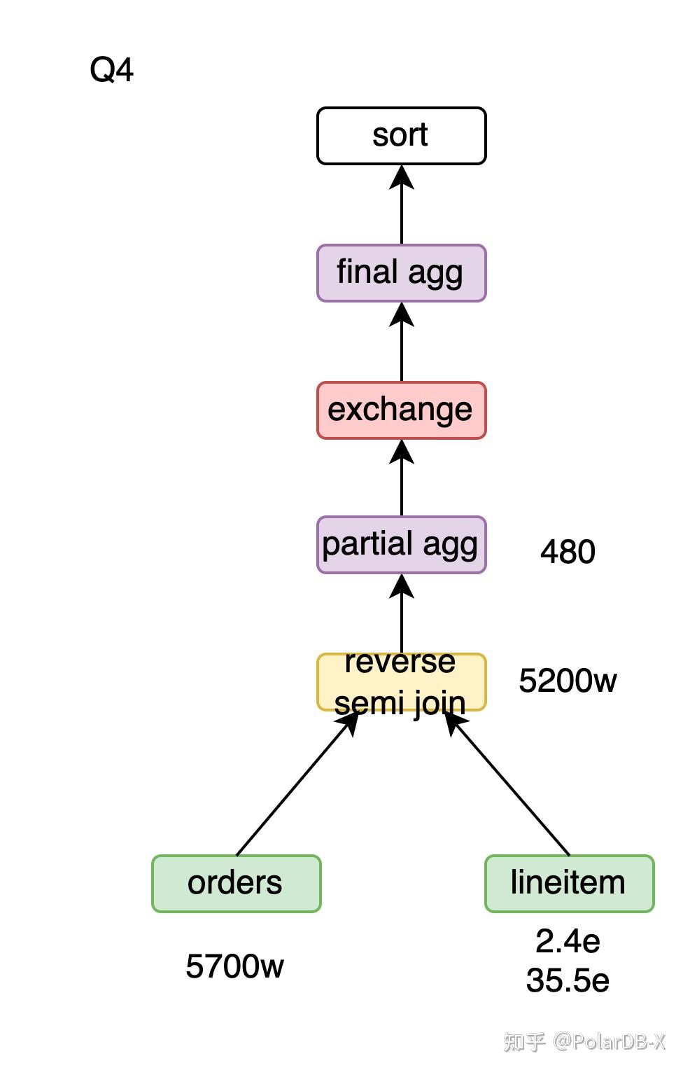 Q4中exists子查询转成semi join后变成了orders semi join lineitem。 用orders semi hash join lineitem,流程为