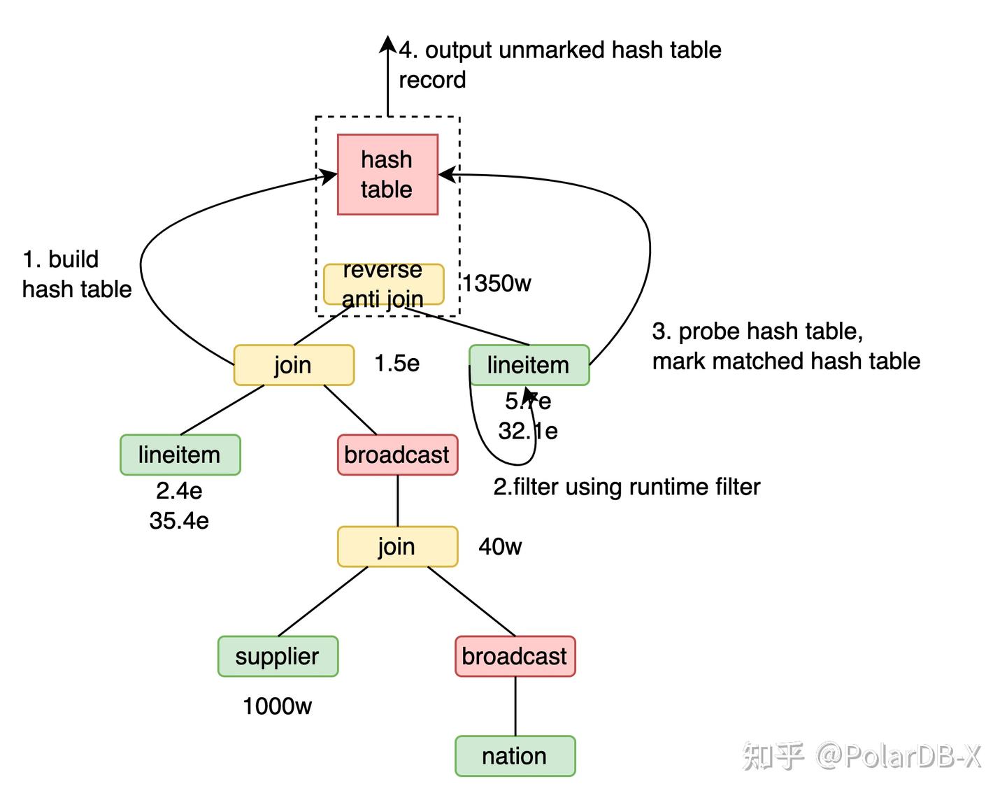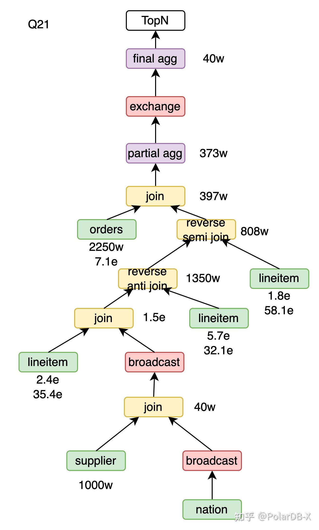 Q21中not exists子查询转成anti join,变成了xx anti join lineitem,这里的xx为linitem、supplier、nation三表join的结果。 用xx anti hash join lineitem,流程为