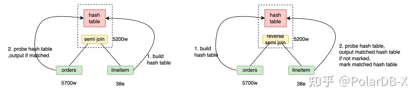 由于探查哈希表效率远高于构建哈希表,当前场景下reverse semi hash join效率更高。
