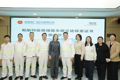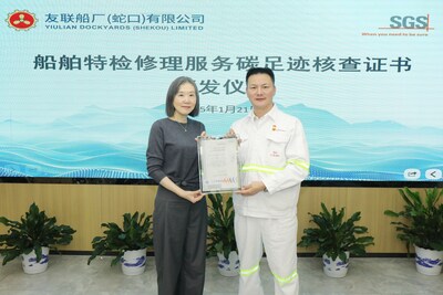 上海2025年1月22日 /美通社/ -- 1月21日,SGS通标标准技术服务有限公司(以下简称SGS)为友联船厂(蛇口)有限公司(以下简称蛇口友联)颁发了船舶特检维修领域首张碳足迹证书,这一成就标志着蛇口友联在绿色低碳发展道路上迈出了坚实的一步,并在碳足迹管理方面取得了显著成效。SGS限用物质测试服务部全球负责人吴梅、蛇口友联副总经理颜长青等双方代表出席颁证仪式。
