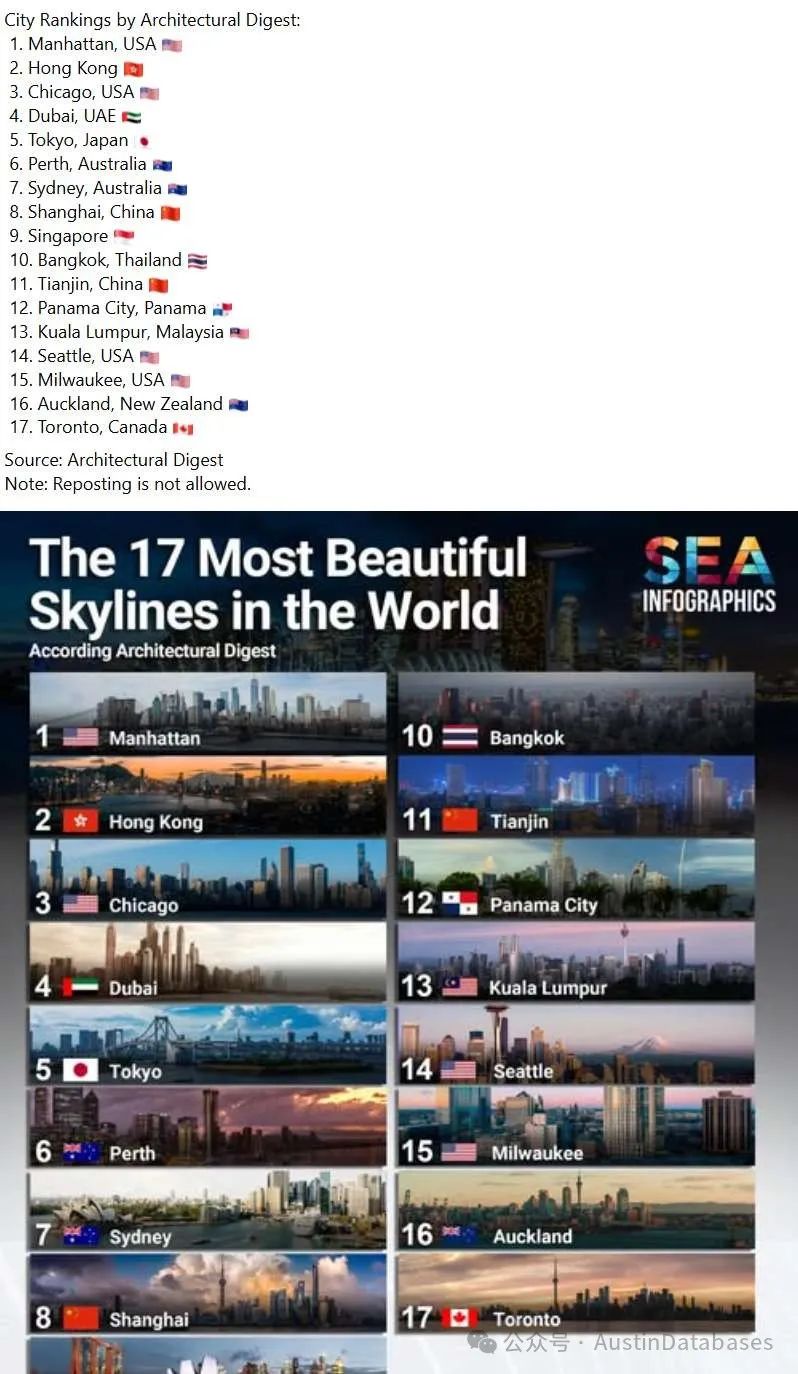 2024世界《建筑文摘》评选世界最美天际线城市,世界17强城市2024年度,中国得到三个席位,三座城市上榜,Hong Kang(香港) 、Shanghai(上海) 、Tianjin(天津) ,如果有时间欢迎来玩 2025年 祝大家万事如意,心想事成。