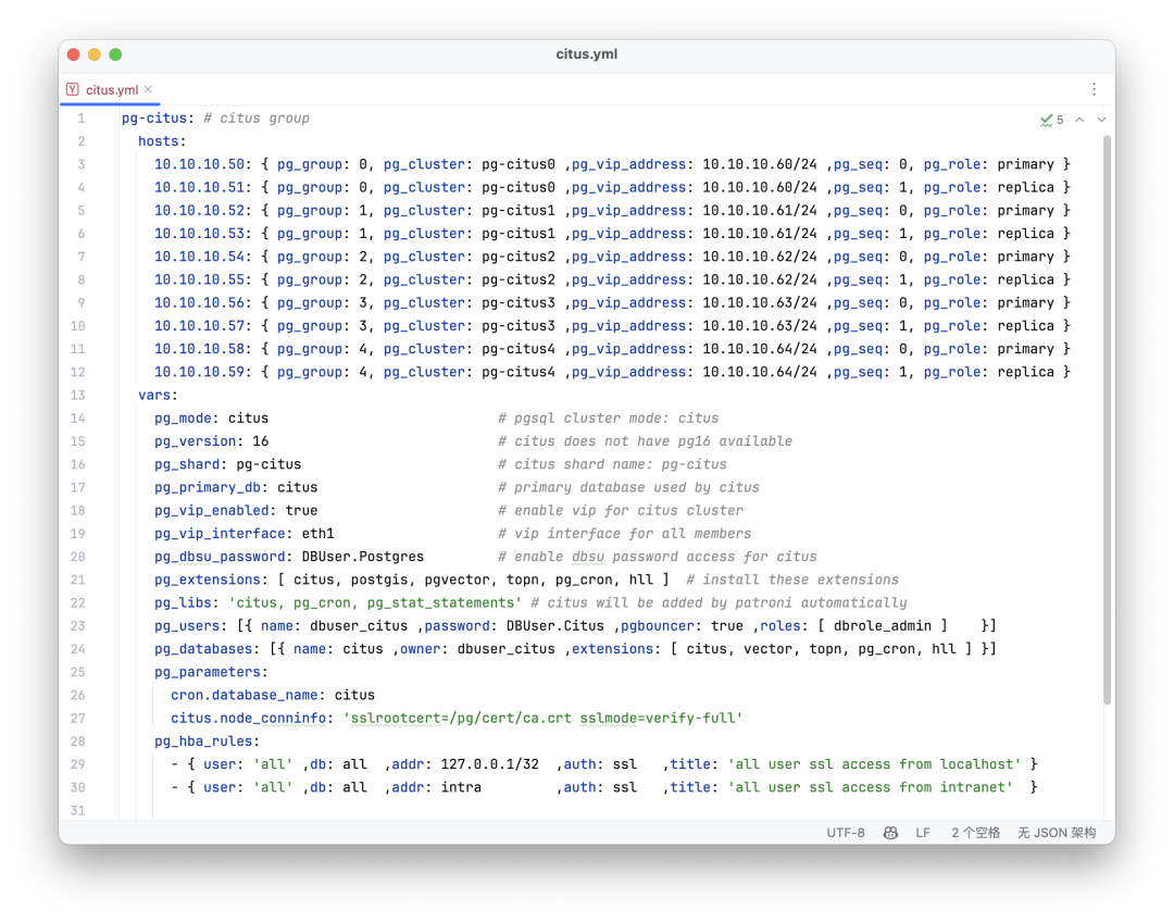 通常来说,分布式数据库的运维管理要比主从麻烦很多,但我们设计了一套优雅的抽象,让部署管理 Citus 变得非常简单 —— 你只需要把他们当作多套水平的 PostgreSQL 集群来处理就好了,下面这个配置就可以一件拉起一套10节点的 Citus。