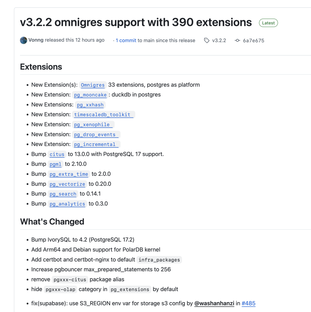 最后,就是 Pigsty v3.2.2 了。这一次 Release 版本号更新带来 40 个全新的扩展插件(当然其中 33 个来自 Omnigres),以及现有扩展的更新版本(比如 Citus,ParadeDB,PGML)。同时,我们还推动并跟进了 PolarDB PG 支持 ARM64,以及支持 Debian 系统,并跟进了 IvorySQL 最新 PostgreSQL 17.2 兼容的 4.2 版本。