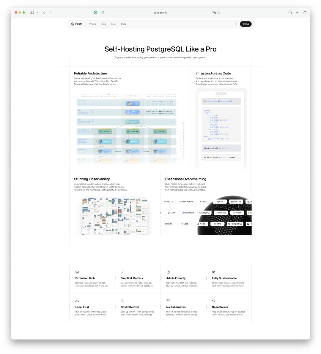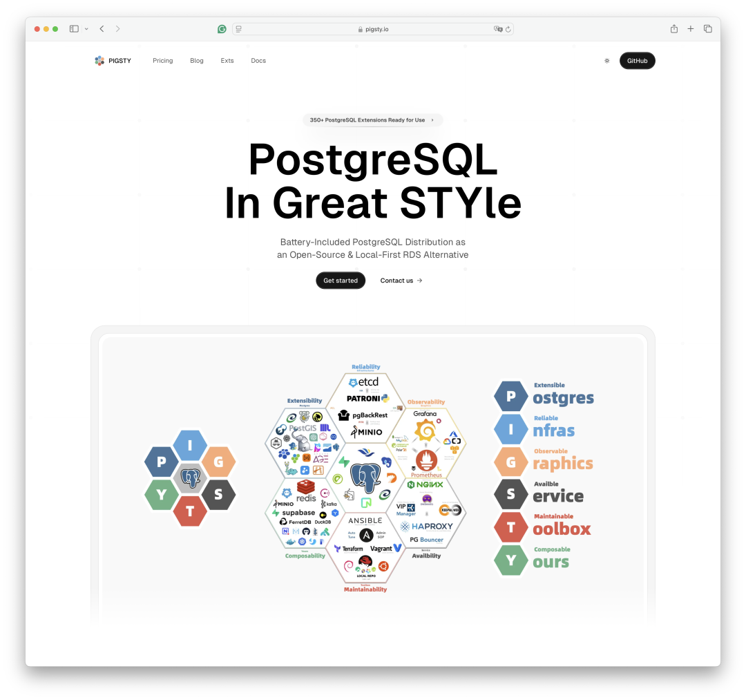 顺便一提,有用户反馈 Pigsty 的老网站太 “丑” 了,一股浓郁的技术直男风味,把所有信息密密麻麻的全部糊在首页上。我觉得,他们说的有一定道理,所以我最近找了个前端模板,重新做了个网站首页,看上去似乎更有 “国际范” 了一些(地址:https://www.pigsty.io )。