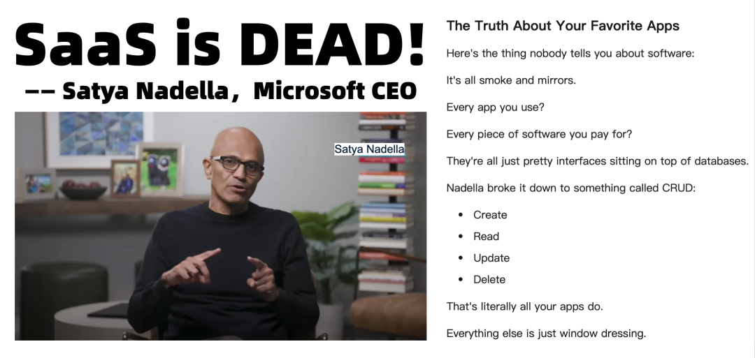 无独有偶,微软的 CEO 纳德拉也公开表示:我们今天所称的软件,其实只是数据库上的一个华丽界面。他将其简化为一个叫“CRUD”的概念:创建(Create)、读取(Read)、更新(Update)和删除(Destroy)。