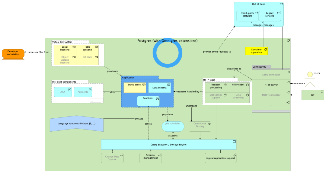 但 Supabase 本身仍然是一系列容器组件缝合拼接起来的,如果这种架构走到极致,大概会变成 Omnigres 的样子 —— 一个运行着 HTTP 服务器的 PostgreSQL,Nothing Else。