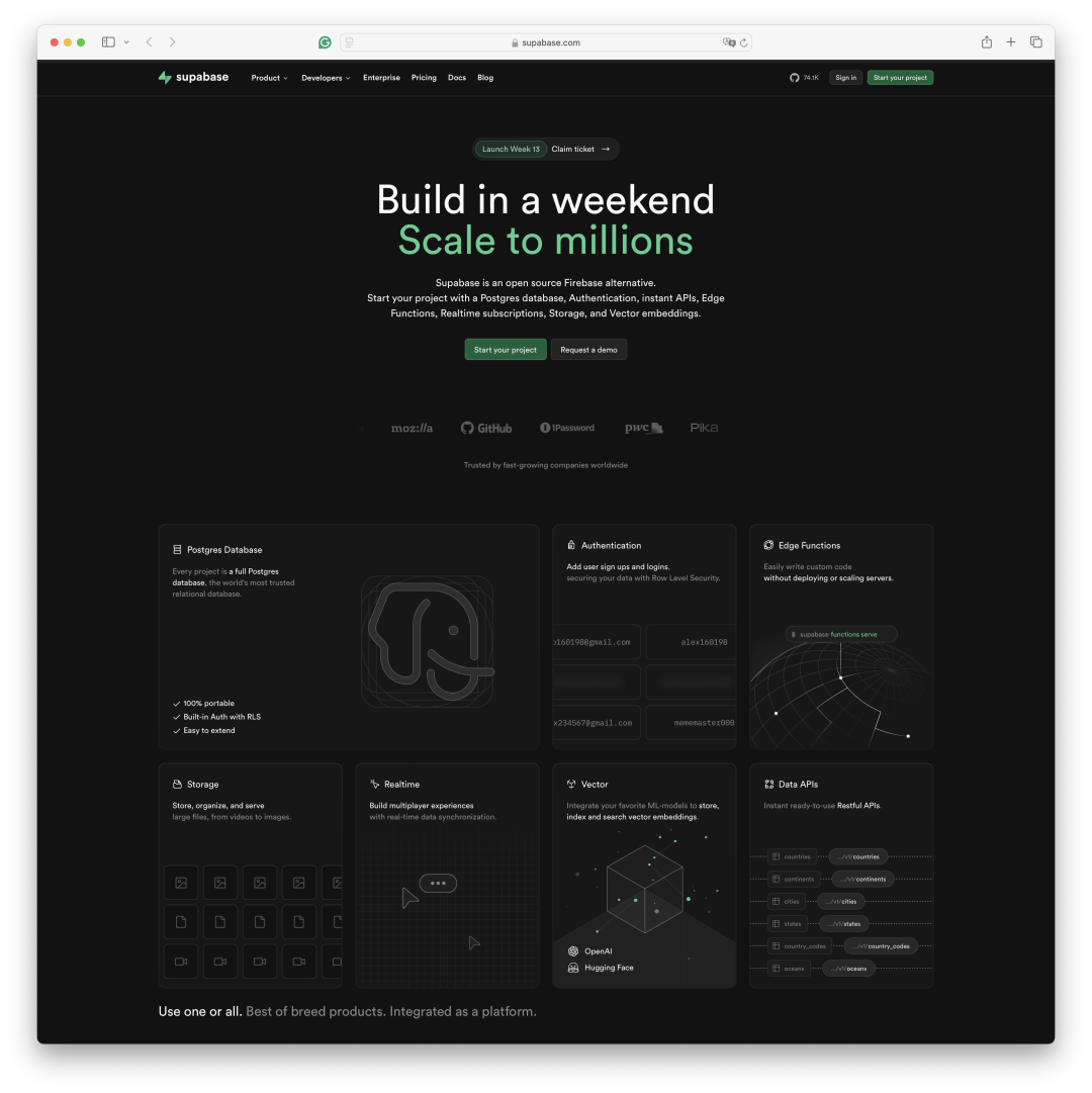 数据库即架构理念有一个非常成功的案例 —— Supabase —— 可能有 80% YC 创业公司都在使用它。Supabase 号称自己是一个 Backend as a Service,将 PostgreSQL,对象存储,以及 EdgeFunction 封装成为一整个运行时,然后将后端与传统意义上的数据库整体打包成为一个 “新的数据库”。