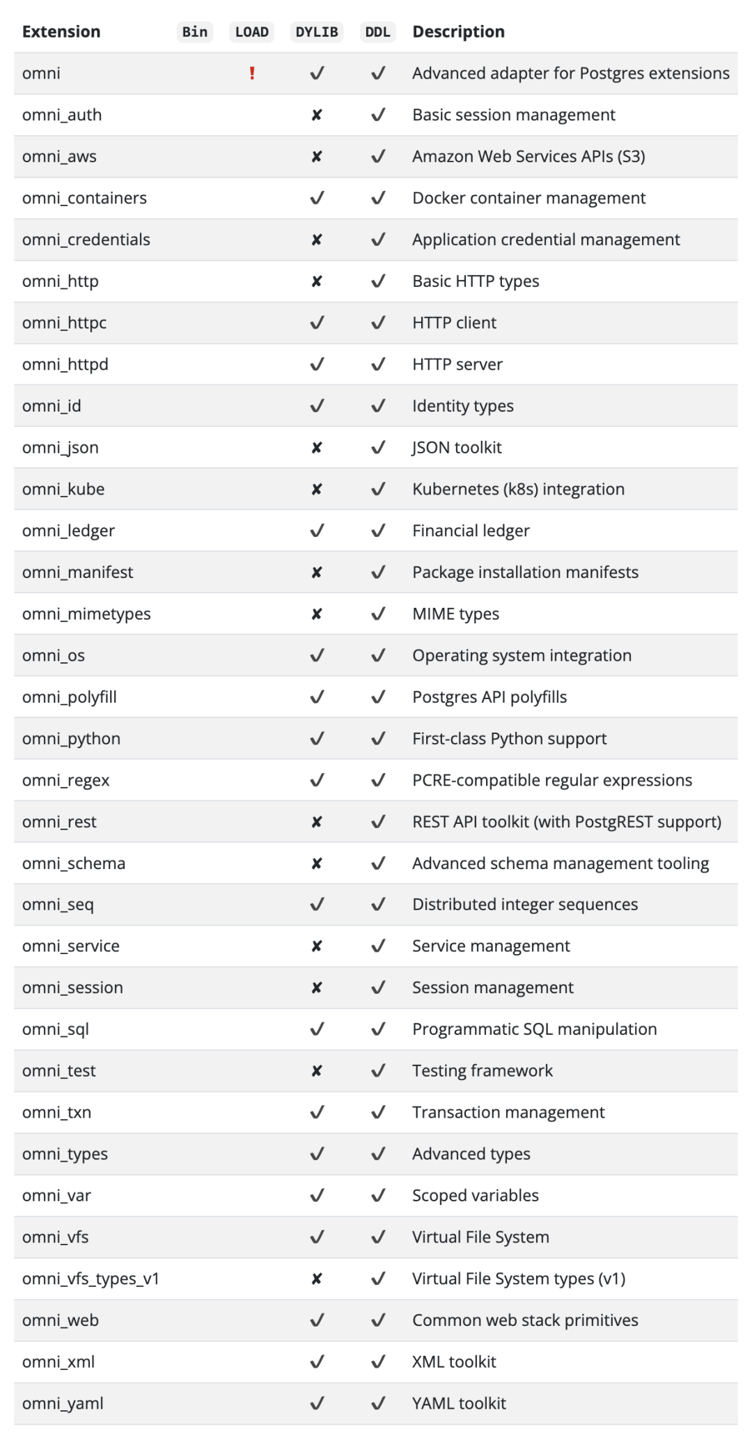 顺便一提,我们已经与 Omnigres 达成了合作。昨天在 Omnigres 创始人 Yurii 的帮助下,我为 Omnigres 构建了主流 Linux 上的 RPM/DEB 包,包含了了以下 33 个扩展插件,开箱即用。(https://ext.pigsty.io/#/omni)