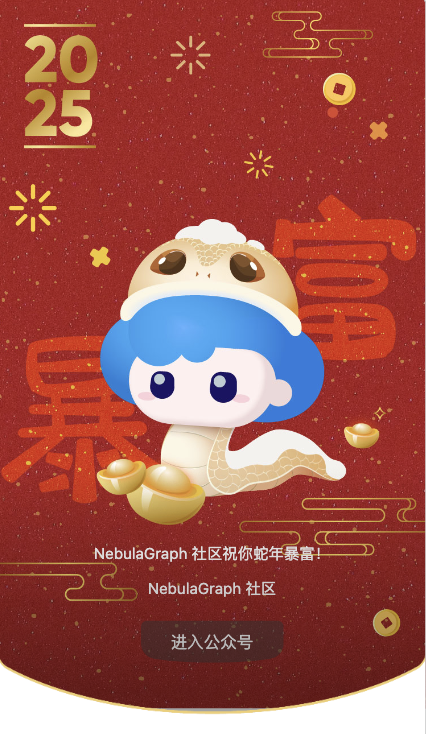 领取方式一:NebulaGraph 红包封面 50 个。本文留言你对 NebulaGraph 的建议,2025 我们努力实现!领取方式二:NebulaGraph 红包封面 50 个。转发本文至朋友圈,发送转发截图至本公众号后台,并回复“蛇年暴富”,新年发发发。先来看看 NebulaGraph 社区 2024 年度总结,回顾与 NebulaGraph 在一起的 2024.