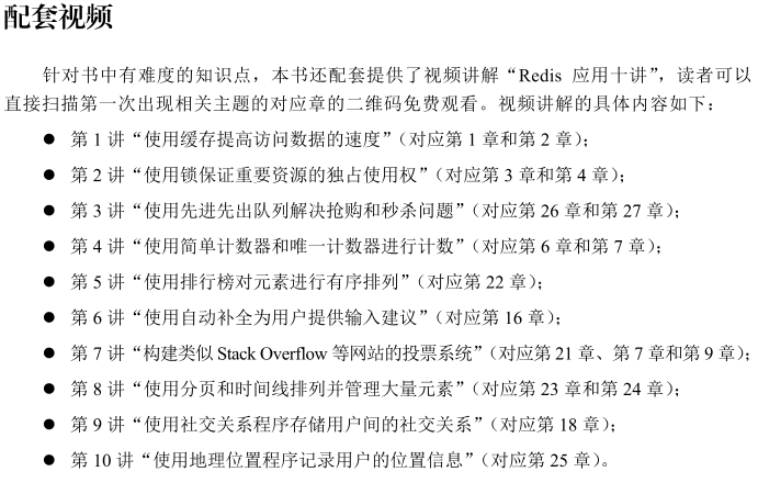 掌握了这 32 个经典实例,读者必定如虎添翼,能够快速构建出稳定高效的应用。 结语 《Redis 应用实例》全面而深入,它凝聚了作者多年的研究和实践经验,通过精心设计的内容和实用的实例,为读者提供 Redis 最佳实践指导。 本书一大特点是覆盖了 Redis 的三个核心应用领域:内部组件、外部应用和数据结构。 从系统内部的缓存和锁机制,到用户直接互动的直播弹幕和社交关系,再到底层的数据结构实现,如队列和栈,本书为读者揭示了 Redis 在不同场景下的强大功能和灵活性。 精彩书摘 另一大特点是面向实战,极具实用性。书中的实例聚焦于核心原理,通过精选的关键 API 和简洁的代码实现,使读者能够快速把握 Redis 的核心概念。 这种聚焦核心的方法有助于读者在掌握基础后,能够灵活地将知识应用到更广泛的情境中。 本书提供了完整的代码示例,所有实例程序均用 Python 编写,代码风格简单直接,易于理解。 书中还附有代码地址链接,读者可以下载运行,进一步学习和实践。 代码示例 本书内容编排合理,逻辑清晰,每章都设计为可以独立阅读,适合自学。 无论是按顺序系统学习,还是根据个人兴趣选择特定章节,读者都可以获得良好的学习体验。 对于书中的难点,本书提供了配套的视频讲解“Redis应用十讲”,通过扫描书中的二维码即可免费观看,为读者提供了更加直观和便捷的学习方式。 本书适合对 Redis 有一定基础的技术人群,无论是想要深化 Redis 技能的开发者,还是希望在项目中应用 Redis 的工程师,都能从这本书中获得宝贵的知识和实用的技巧。 学会《Redis 应用实例》的 32 个经典案例,互联网应用开发全都能拿下! ▼点击下方,即可购书