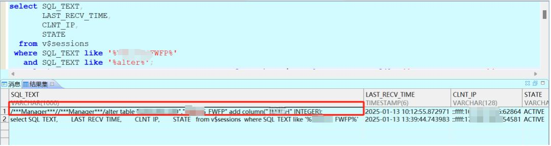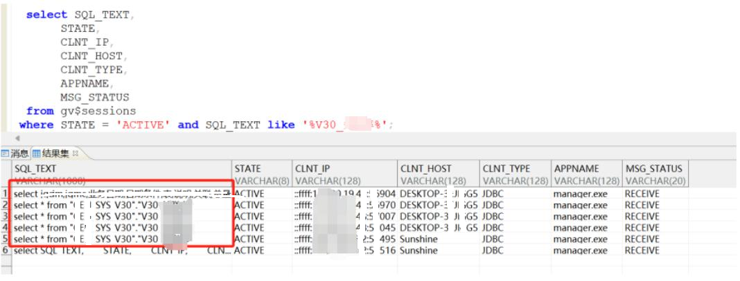 select SQL_TEXT,STATE,CLNT_IP,CLNT_HOST,CLNT_TYPE,APPNAME,MSG_STATUSfrom gv$sessionswhere STATE = 'ACTIVE' and SQL_TEXT like '%V30_XXX%';