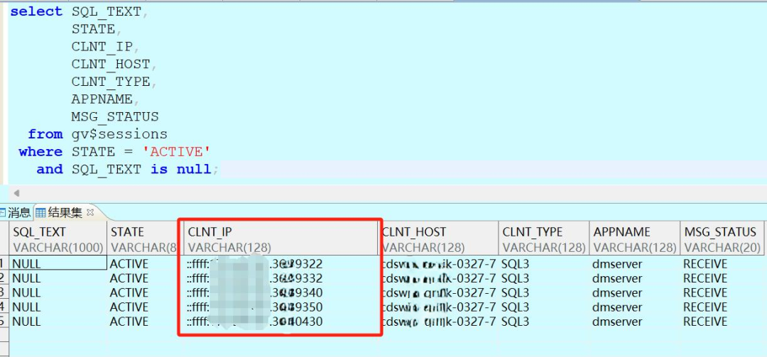 select SQL_TEXT,STATE,CLNT_IP,CLNT_HOST,CLNT_TYPE,APPNAME,MSG_STATUSfrom gv$sessionswhere STATE = 'ACTIVE'and SQL_TEXT is null;