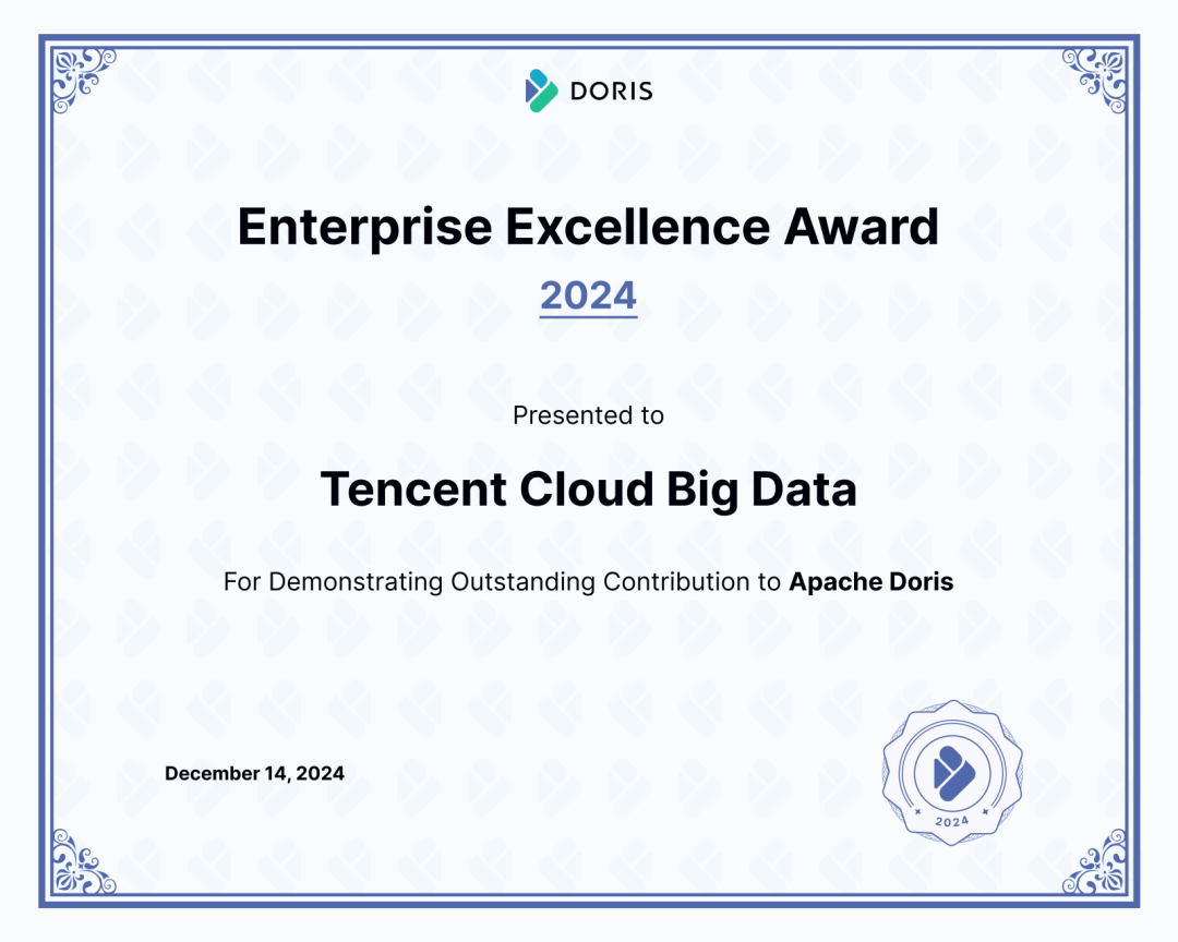 目前腾讯云已发展 2 名社区 PMC 成员、近 10 名 Committer 以及数十名活跃贡献者,成为 Apache Doris 社区在全球范围内贡献者最多、贡献度最大的云厂商。凭借在开源社区的持续贡献,腾讯云 TCHouse 团队荣获社区「年度卓越贡献奖」。