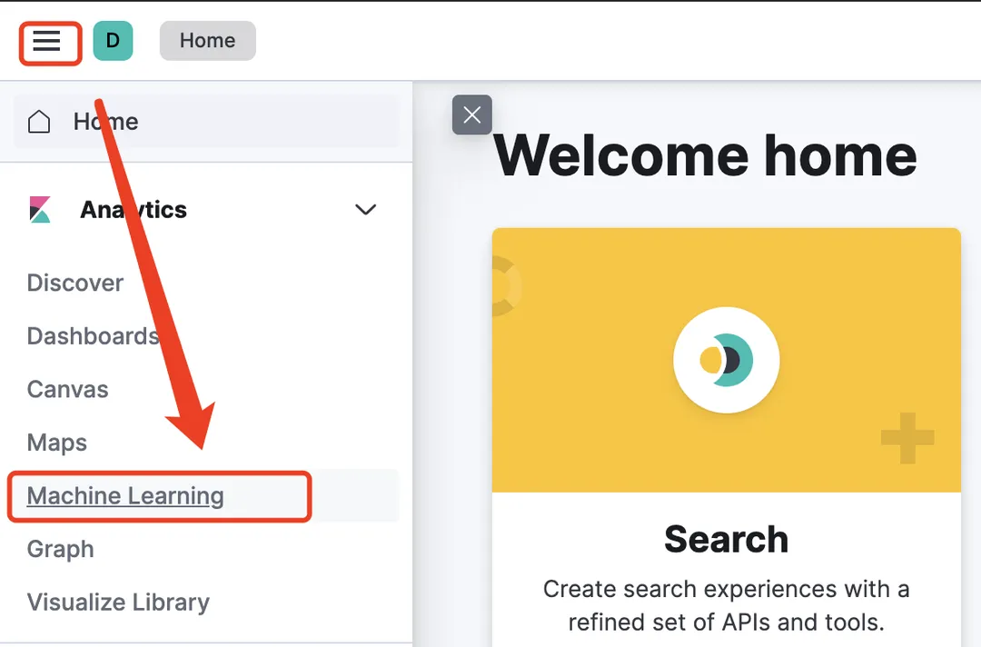 2、登录 Kibana 之后,在左侧导航栏找到「Machine Learning」功能: