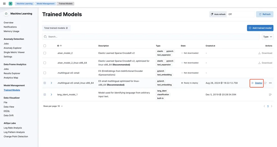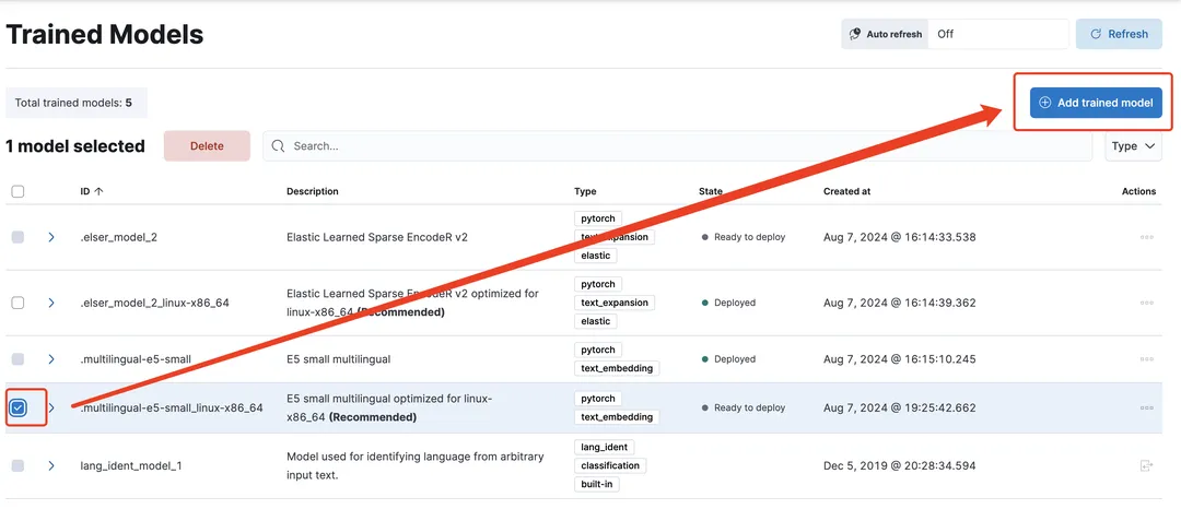 如为未下载状态,选中模型,并点击「Add trained model」,本次演示我们使用「.multilingual-e5-small_linux-x86_64」模型,这是一个 384 维的多语言模型: