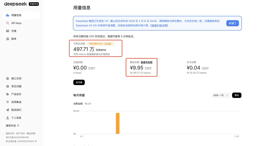 2、获取DeepSeek(此处超链接),当前可免费使用 500 万 tokens: