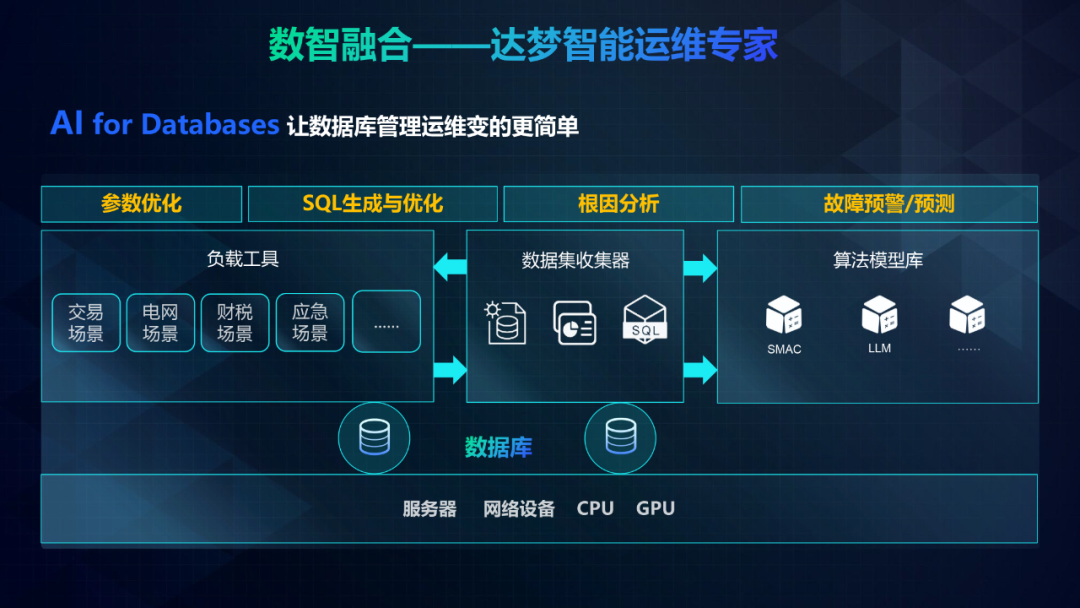 达梦数据库智能运维平台结合 AI for DB、DB for AI 理念,使用机器学习相关技术和相关算法,实现数据库自治运维和管理,从而帮助数据库运维人员减少运维工作量;建立算法模型库和知识库,解决不同场景下的数据库管理需求,解决 SQL 优化、故障预测预警、根因分析、自动缩扩容等需求;提供数据库智能运维,使得用户可以更方便、快捷管理数据库,拥有更高性能、智能化、自主的数据库智能化服务解决方案。